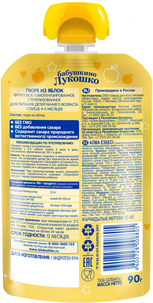 Бабушкино Лукошко Пюре детское «Яблоко»В данный момент этот товар отсутствует в продаже. Возможно, у нас найдется аналогичный или похожий товар здесь. Пюре Бабушкино лукошко Яблоко без сахара, однокомпонентное для детей с 4-х месяцев. Отсутствие сахара в пюре соответствует последним рекомендациям детских диетологов и позволяет сформировать привычки здорового питания с самого раннего возраста. Пюре благоприятно влияет на кровеносную систему. Защищает слизистую желудка и кишечника ребенка. Помогает при расстройстве стула. |