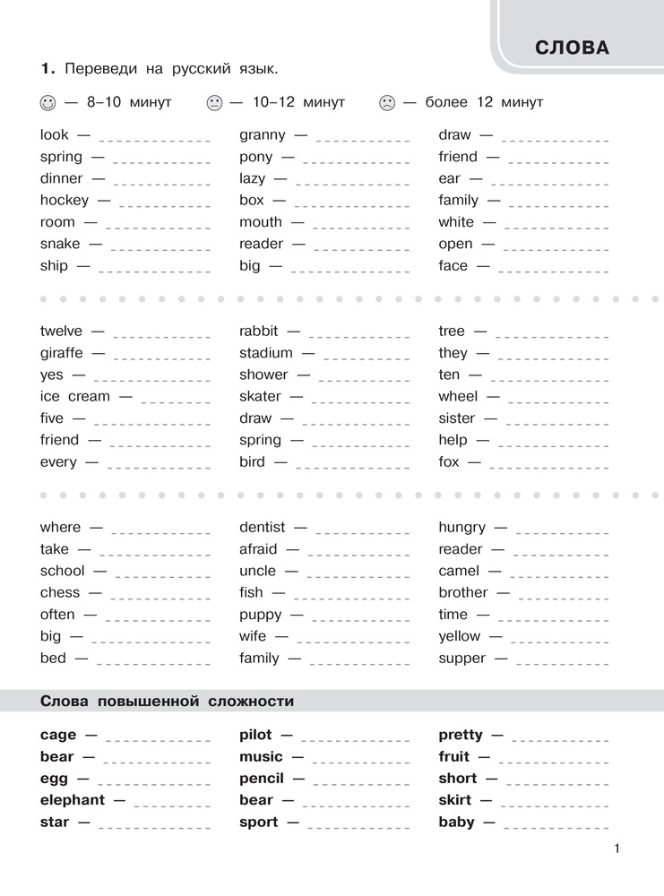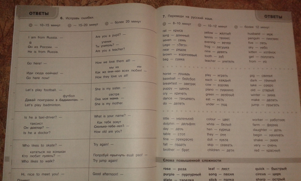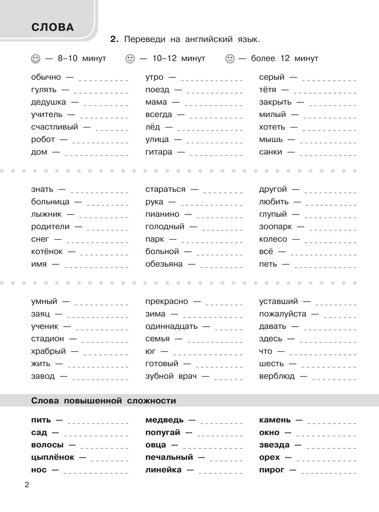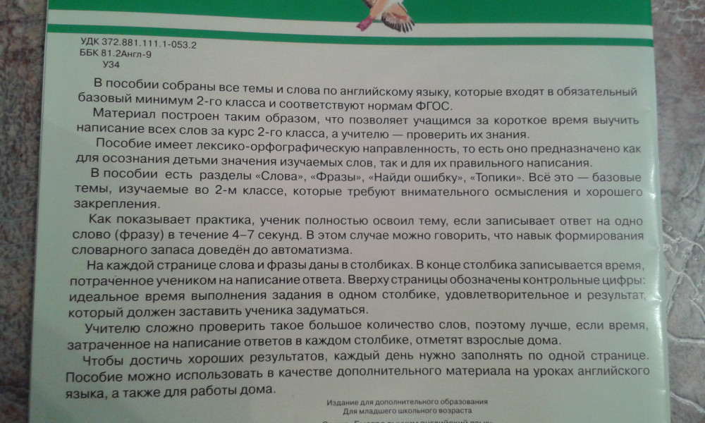 3000 английских слов. Обязательный лексический минимум. 2 класс. 2 частьОльга Васильевна Узорова, Елена Алексеевна Нефедова В данный момент этот товар отсутствует в продаже. Возможно, у нас найдется аналогичный или похожий товар здесь. Серия: Быстро выучим английский язык В пособии собраны все темы и слова по английскому языку, которые входят в обязательный базовый минимум 2-го класса и соответствуют нормам ФГОС. Материал построен таким образом, что позволяет учащимся за короткое время выучить все слова за курс 2-го класса, а учителю - проверить их знания. Пособие имеет лексико-орфографическую направленность, то есть предназначено как для осознания детьми правильного значения изучаемых слов, так и для запоминания их правильного написания. В пособии есть разделы "Слова", "Фразы", "Найди ошибку", "Топики". Все это - базовые темы, изучаемые во 2-м классе, которые требуют внимательного ослысления и хорошего закрепления. Как показывает практика, ученик полностью освоил тему, если записывает ответ на одно слово (фразу) в течение 4-7 секунд. В этом случае можно говорить, что навык формирования словарного запаса доведен до автоматизма. На каждой странице слова и фразы даны в столбиках. В конце столбика записывается время, потраченное учеником на написание ответа. Вверху страницы обозначены контрольные цифры: идеальное время выполнения задания в одном столбике, удовлетворительное и результат, который должен заставить ученика задуматься. Учителю сложно проверить такое большое количество слов, поэтому лучше, если время, затраченное на написание ответов в каждом столбике, отметят взрослые дома. Чтобы достичь хороших результатов, каждый день нужно заполнять по одной странице. Пособие можно использовать в качестве дополнительного материала на уроках английского языка, а также для работы дома. |