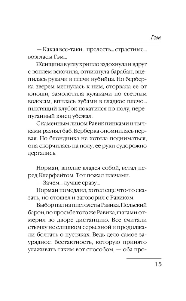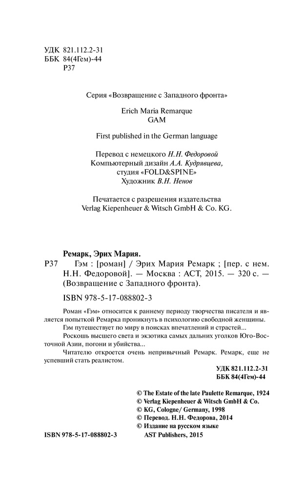 ГэмВ данный момент этот товар отсутствует в продаже. Возможно, у нас найдется аналогичный или похожий товар здесь. Серия: Возвращение с Западного фронта Роман "Гэм" относится к раннему периоду творчества писателя и является попыткой Ремарка проникнуть в психологию свободной женщины. Гэм путешествует по миру в поисках впечатлений и страстей… Роскошь высшего света и экзотика самых дальних уголков Юго-Восточной Азии, погони и убийства… Читателю откроется очень непривычный Ремарк. Ремарк, еще не успевший стать реалистом. |