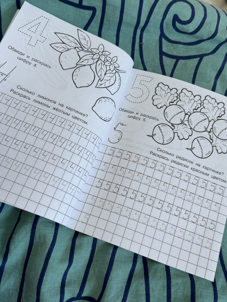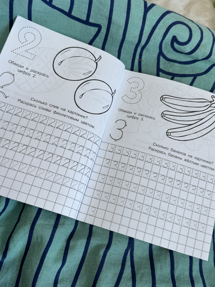 К написанию каждой цифры идет картинка, которую нужно разукрасить. Это как раз то что нужно чтобы заинтересовать дошкольника+цена=5+.