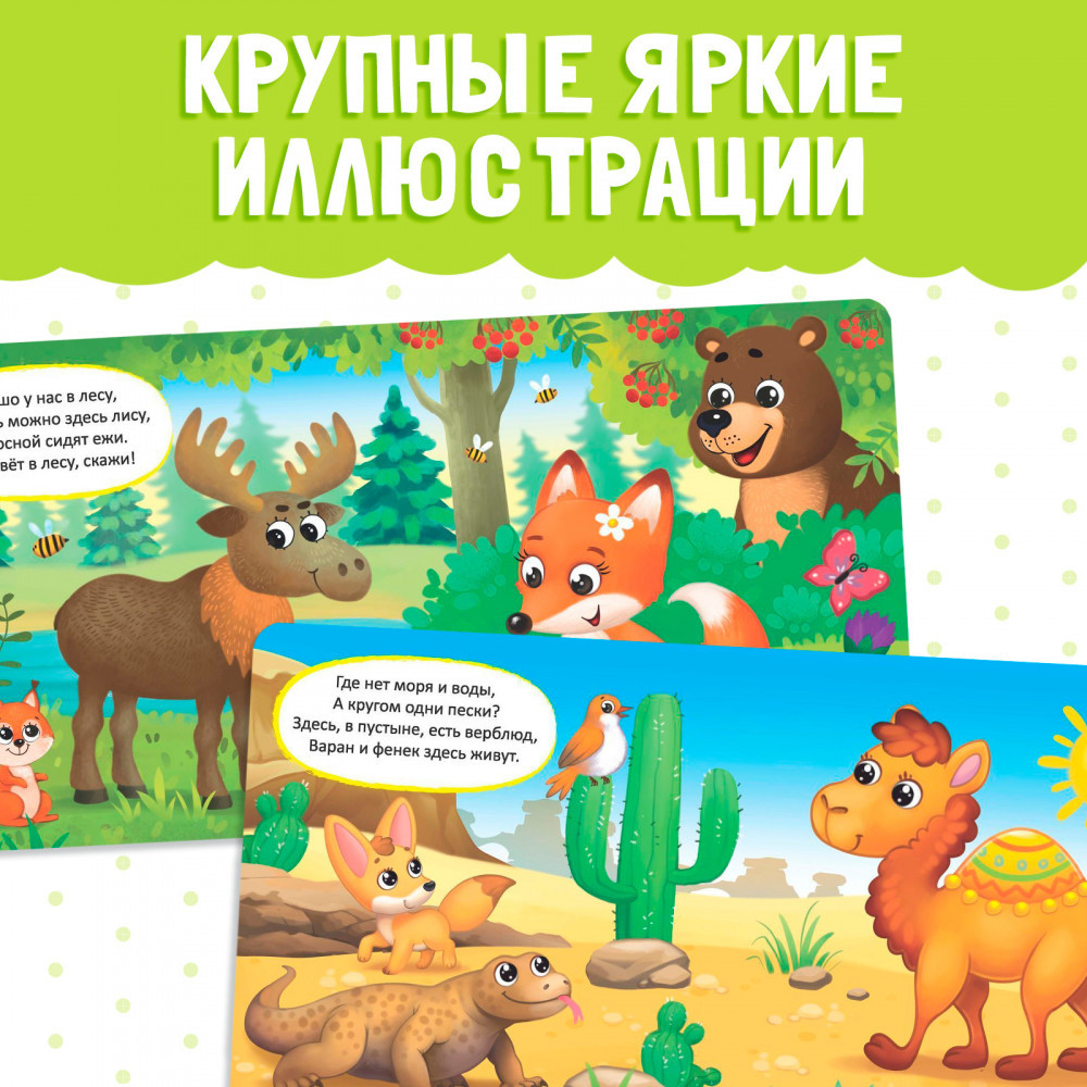 💳 Оплатить за товар можно при получении 🇰🇿 Есть бесплатная доставка по Казахстану от 1 дня 🎁 Копите бонусы с каждой покупки Картонная книга с яркими картинками познакомит малыша с животными и расскажет, где они обитают. Красочные иллюстрации и весёлые стихи помогут ребёнку запомнить повадки и особенности зверей. |