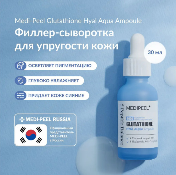 Увлажняющая витаминная ампула для сияния кожи Medi-Peel Glutathione Hyal Aqua Ampoule восполняет недостаток влаги, успокаивает и освежает кожу, дарит здоровое сияние и устраняет тусклый цвет лица. Средство уменьшает видимость веснушек и пигментации, препятствует появлению новых пигментных пятен, выравнивает тон. Увлажняет, борется с обезвоженностью, смягчает огрубевшие участки, поддерживает упругость и гладкость рельефа, препятствует появлению морщин за счёт пептидов в составе.
