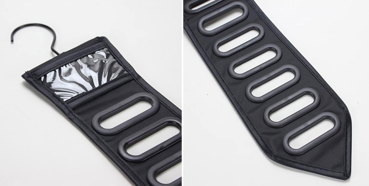 12 прорезей для галстуков и 2 прозрачных кармашка наверху (по одному с каждой стороны) для хранения запонок и зажимов для галстуков. Прорези гладкие, поэтому органайзер может быть удобен и для хранения женских лёгких шарфов-жаток, не жестких по качеству поясов и детских лент-бантов. Вещь нужная. Выполнена добротно. Оба заказанных органайзера ждут своего праздничного часа. И более чем уверена - понравятся одариваемым.