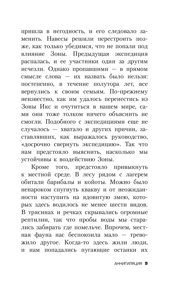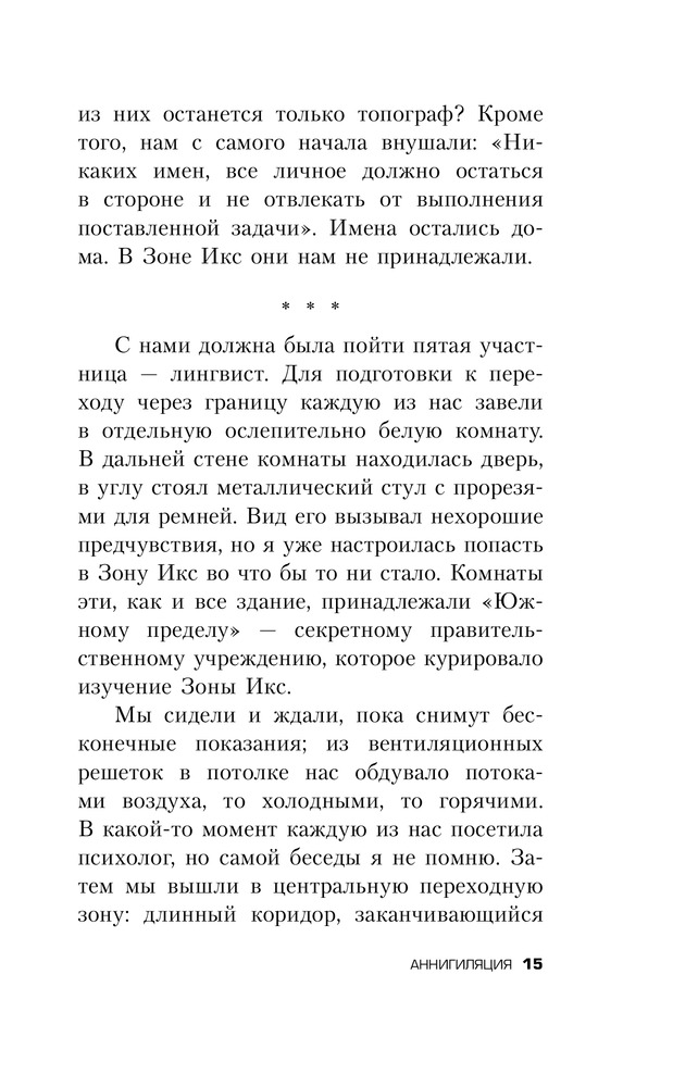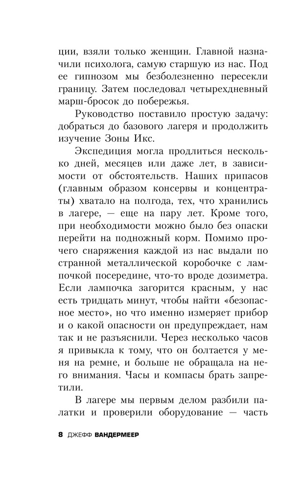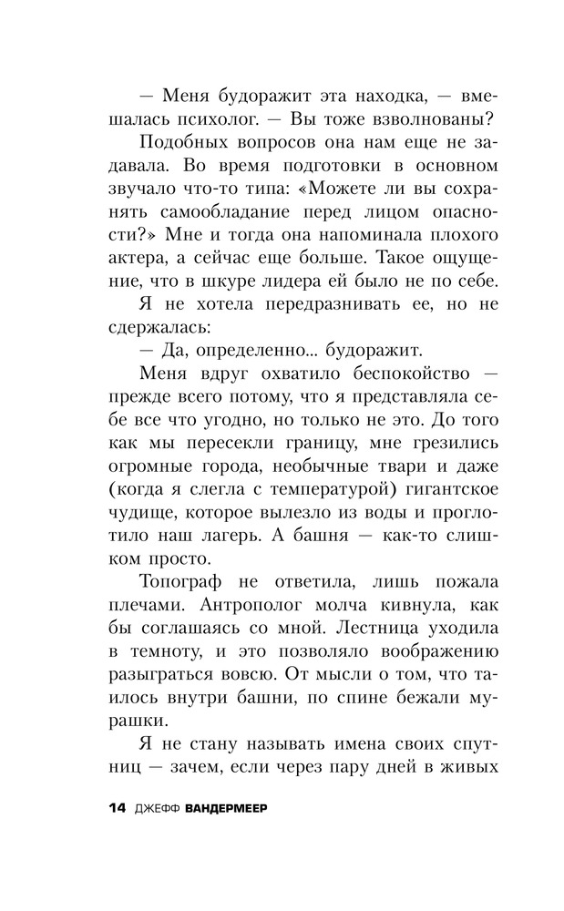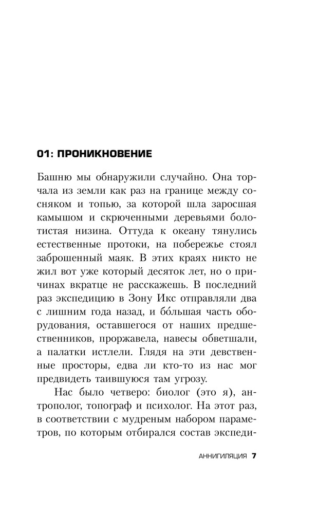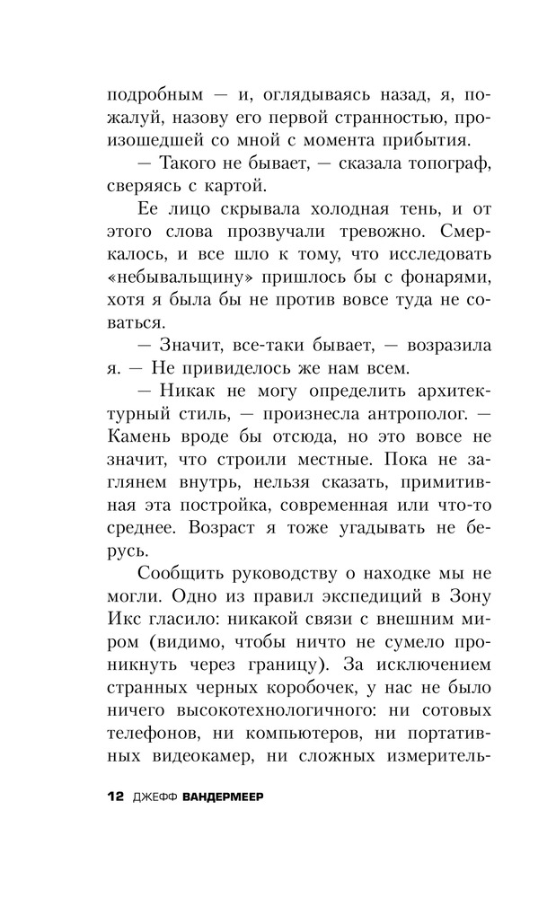 В данный момент этот товар отсутствует в продаже. Возможно, у нас найдется аналогичный или похожий товар здесь. Никто не знает, откуда взялась Зона Икс – смертельно опасная территория, кишащая аномальными явлениями. Там не бегают чудовища, оттуда не приносят трофеев, и охотники за наживой там не промышляют. Тайная правительственная организация отправляет в Зону одну исследовательскую экспедицию за другой, но чаще всего те не возвращаются – или возвращаются, но неуловимо и страшно изменившись. Сможет ли новая, двенадцатая экспедиция в Зону добиться того, что не удалось предшественникам и раскрыть тайны этого проклятого места? Оставив позади имена и прежние жизни, четыре женщины – психолог, биолог, топограф и антрополог – отправляются навстречу чуждой, нечеловеческой тайне. |