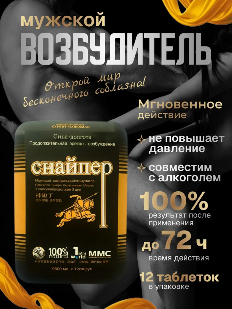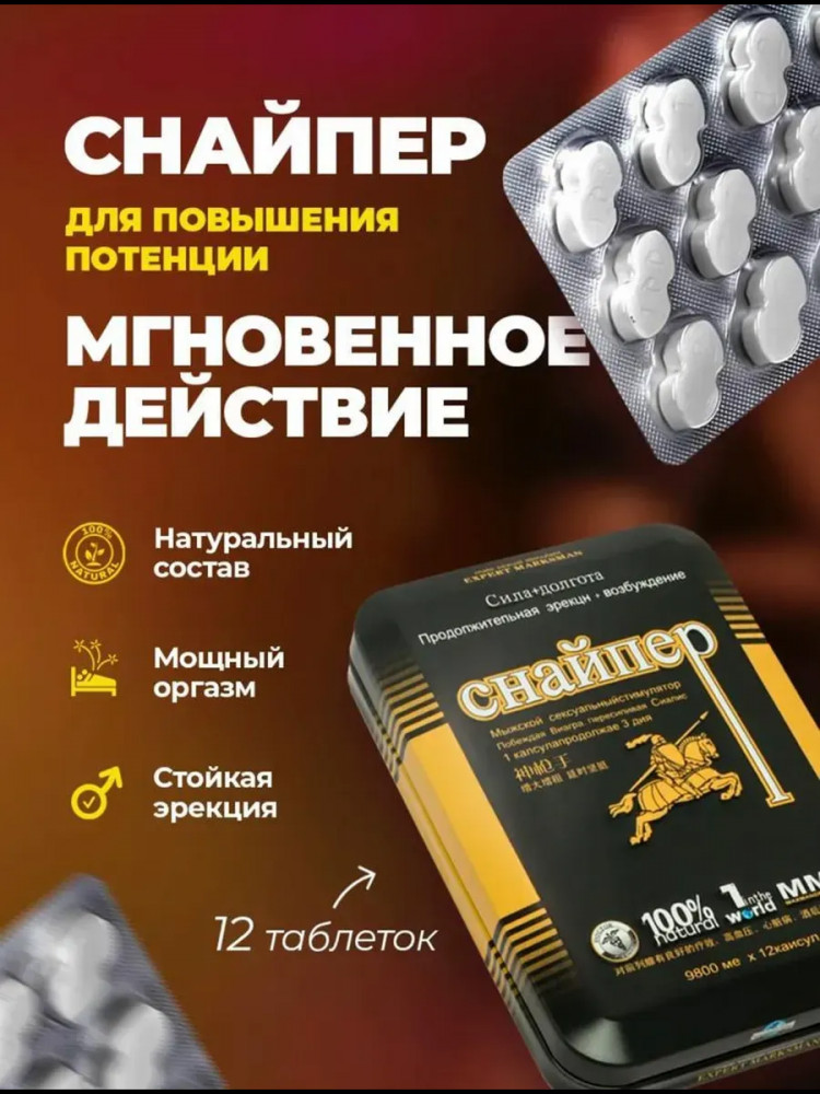 Хотите ощутить незабываемые мгновения в постели и доставить своей любимой партнерше и себе невероятное удовольствие во время секса? Тогда наш товар для взрослых 18+ — создан именно для вас. Снайпер — это быстродействующий возбудитель в таблетках, предназначенный специально для мужчин. Мы понимаем, что сексуальная жизнь играет огромную роль в самооценке и общем самочувствии. Однако, с годами, потенция может начать подводить, а интимные отношения перестают приносить такое же удовлетворение и оргазм, как раньше. Не стоит отчаиваться! Мы предлагаем вам надежного помощника в капсулах. Изготовленный из высококачественных и натуральных ингредиентов, этот препарат способен усилить влечение, улучшить выработку тестостерона, повысить эрэкцию и выносливость. Наша формула основана на проверенных компонентах, которые помогут вам достичь максимального эффекта.