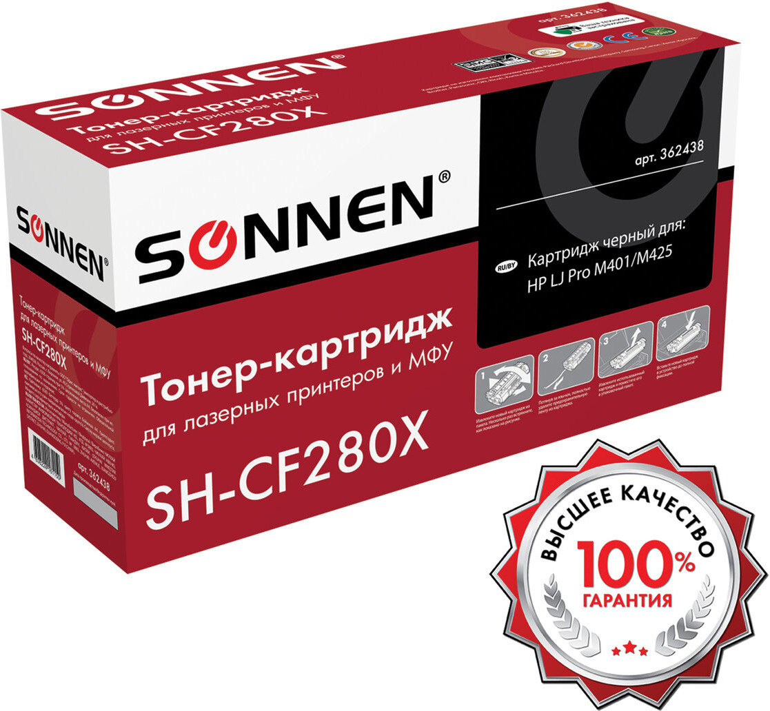 Совместимый картридж Sonnen SH-CF280X для лазерных принтеров: HP LaserJet Pro M401/M425. Совместимые лазерные картриджи Sonnen — это оригинальное качество по доступной цене. Данная модель содержит ЧИП, подходит для лазерных принтеров и МФУ HP LaserJet Pro M401/M425. Картридж повышенной емкости. Ресурс — 6500 страниц. Картриджи Sonnen обладают четкой графикой, что обеспечивает высокое качество печати с первой до последней страницы. Совместимый картридж Sonnen — это оптимальная альтернатива оригинальному картриджу. Он не уступает оригиналу ни по качеству печати, ни по экономичности, ни по сроку службы. Картриджи Sonnen полностью соответствует международным стандартам качества.