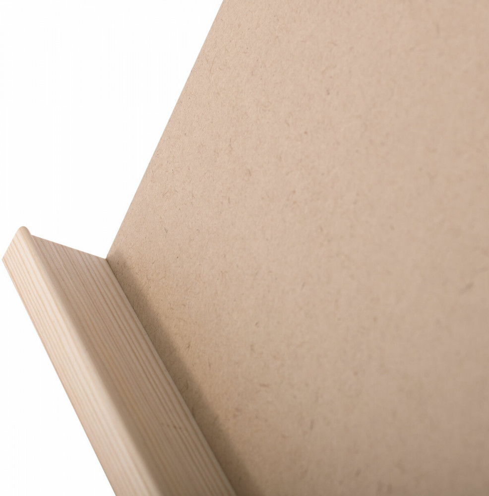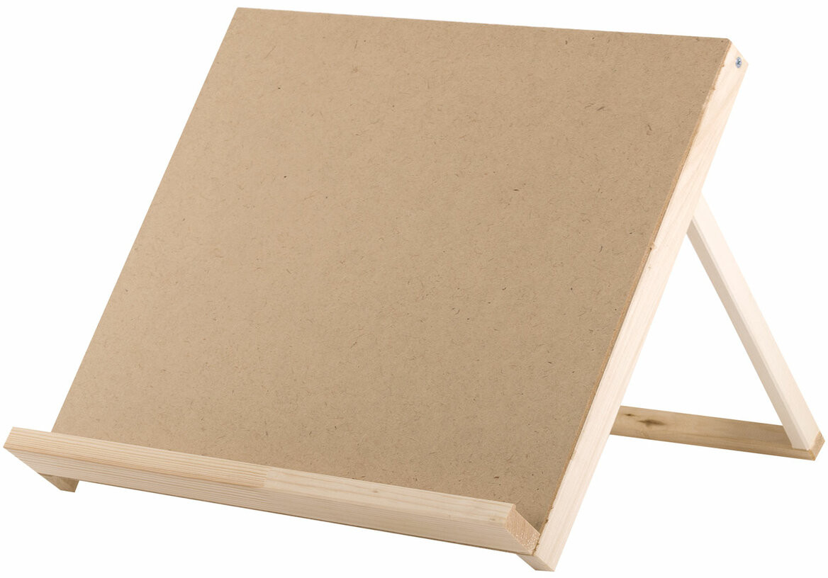 Настольный планшетный мольберт изготовлен из липы. Мольберт отлично подходит для работы с малыми и средними форматами, максимальный размер бумаги — А3. Планшет мольберта представляет собой жесткую основу, за счет этого на мольберте легко можно закрепить бумагу малярным скотчем или зажимами. Поверхность планшета хорошо отшлифована и подходит даже для тонкой бумаги. Наклон мольберта фиксируется в одном положении с помощью верёвки. Мольберт удобно хранить в сложенном виде. Высота холста — до 40 см. Размер в разложенном виде — 38×45×36см. Вес — 1,35 кг.