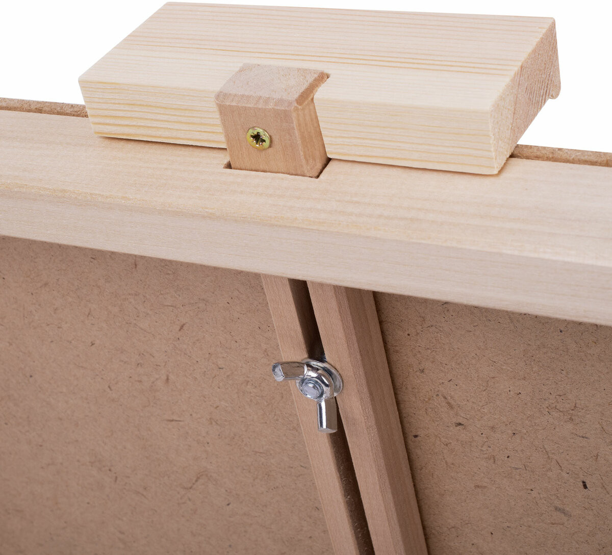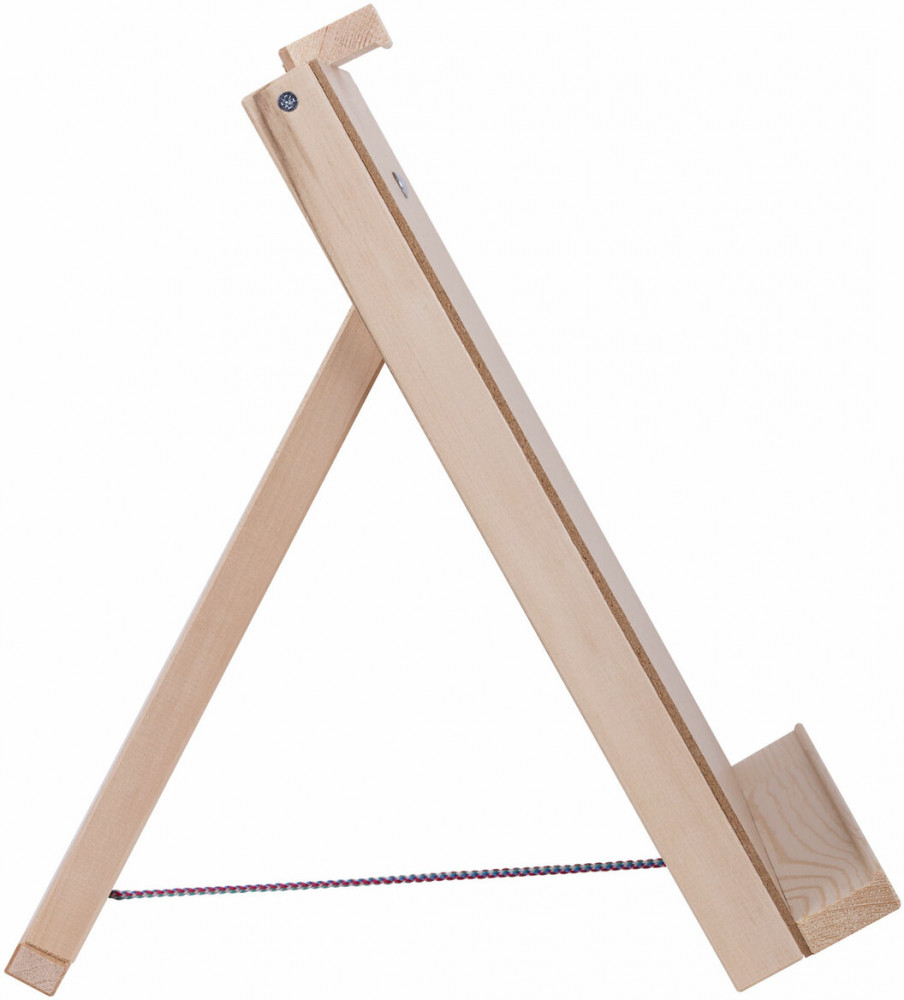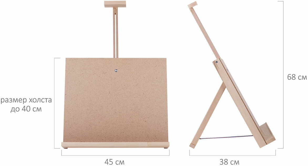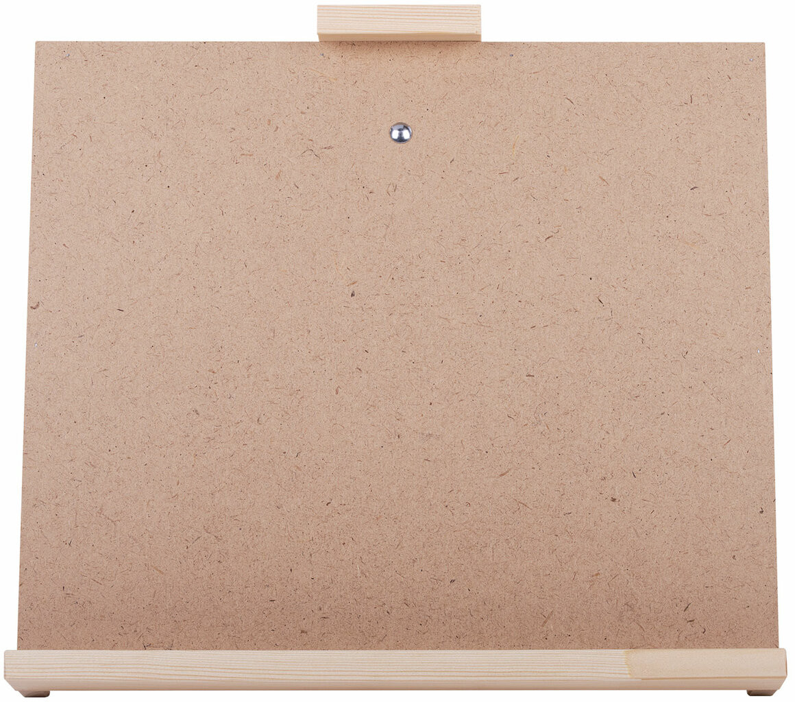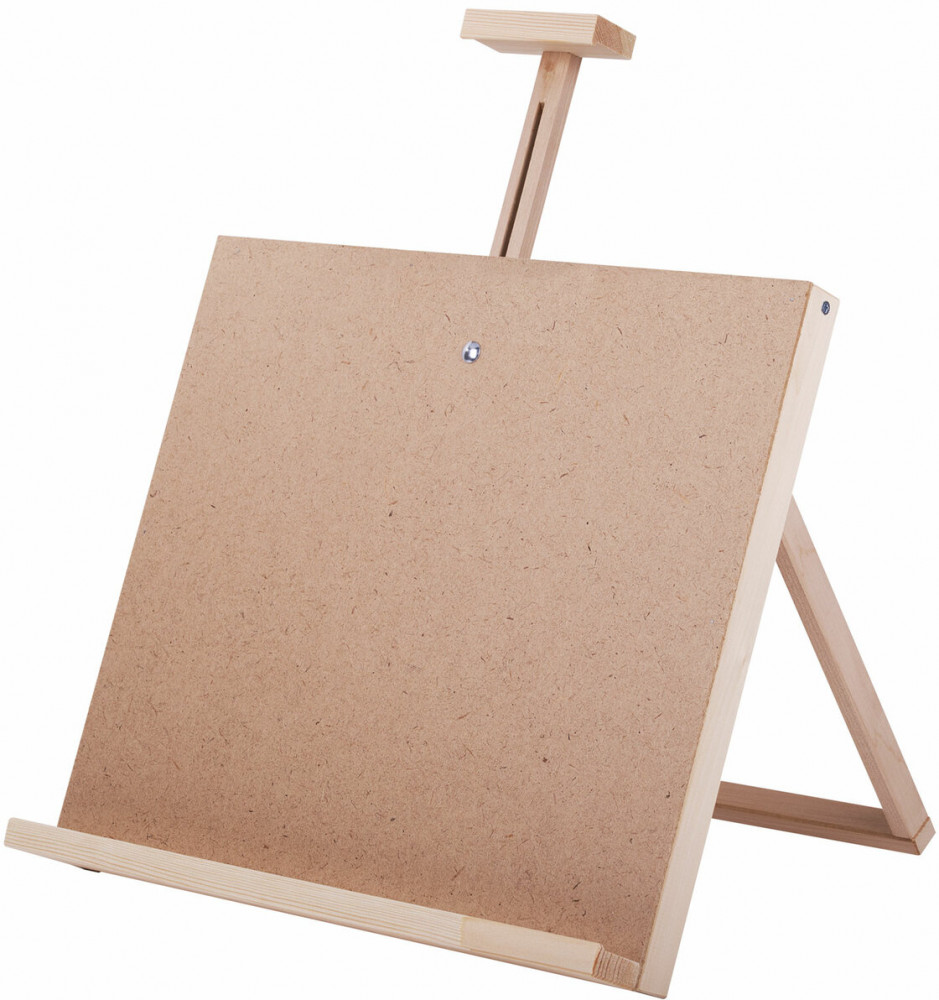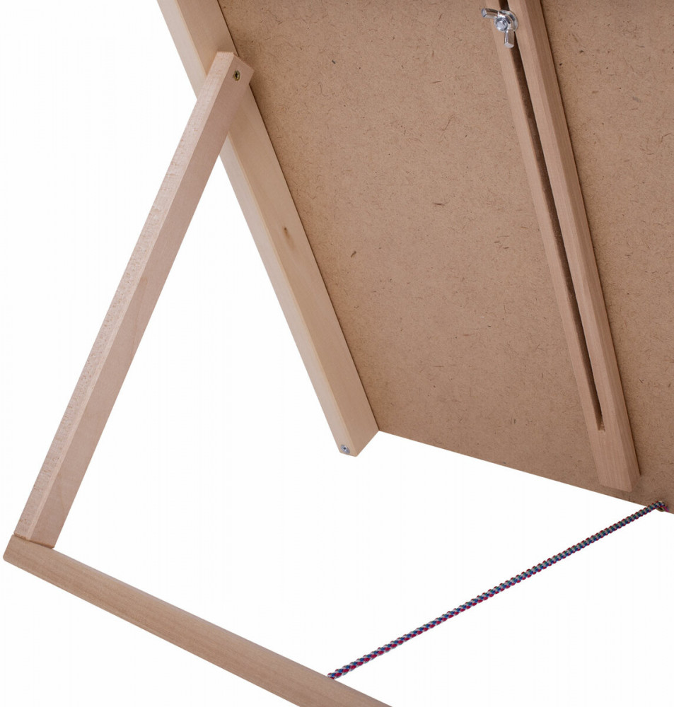 Настольный планшетный мольберт изготовлен из липы. Мольберт-планшет отлично подходит для работы с малыми и средними форматами, максимальный размер холста — 65 см. Планшет мольберта представляет собой жесткую основу, за счет этого на мольберте легко можно закрепить бумагу малярным скотчем или зажимами. Поверхность планшета хорошо отшлифована и подходит даже для тонкой бумаги. Наклон мольберта фиксируется в одном положении с помощью верёвки. Мольберт удобно хранить в сложенном виде.
