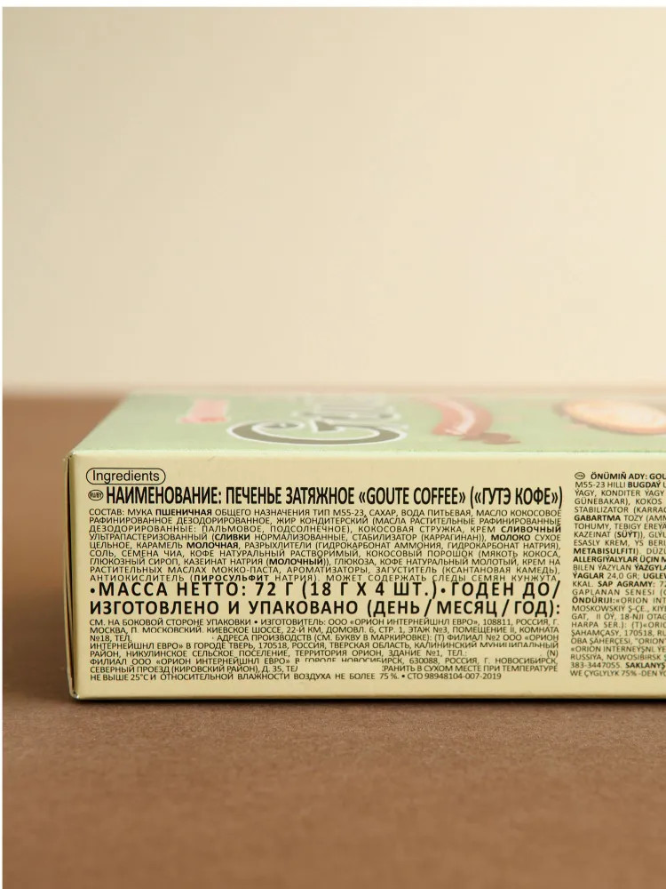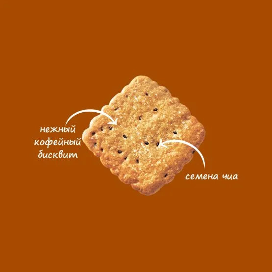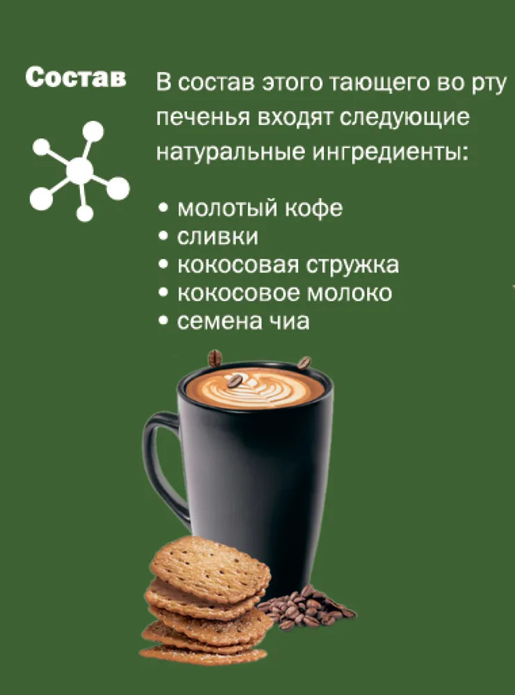 Мука пшеничная общего назначения тип М 55-23, сахар, вода питьевая, масло растительное (рафинированное дезодорированное кокосовое), жир кондитерский (рафинированное дезодорированное пальмовое масло, антиокислитель (E306)), кокосовая стружка, молоко сухое цельное, заменитель сливок (патока, рафинированные дезодорированные растительные масла (пальмовое, пальмоядровое), казеинат натрия (молочный), эмульгаторы (Е471, Е481), стабилизатор (Е340(II)), агент антислеживающий (Е551), ароматизаторы), крахмал пшеничный, разрыхлители (гидрокарбонат аммония, гидрокарбонат натрия), кофе натуральный растворимый, семена чиа, сливки натуральные пастеризованные, молоко кокосовое сухое (мякоть кокоса, глюкозный сироп, казеинат натрия (молочный)), соль, кофе натуральный молотый,глюкоза, ароматизаторы, загуститель (ксантановая камедь), антиокислитель (пиросульфит натрия).