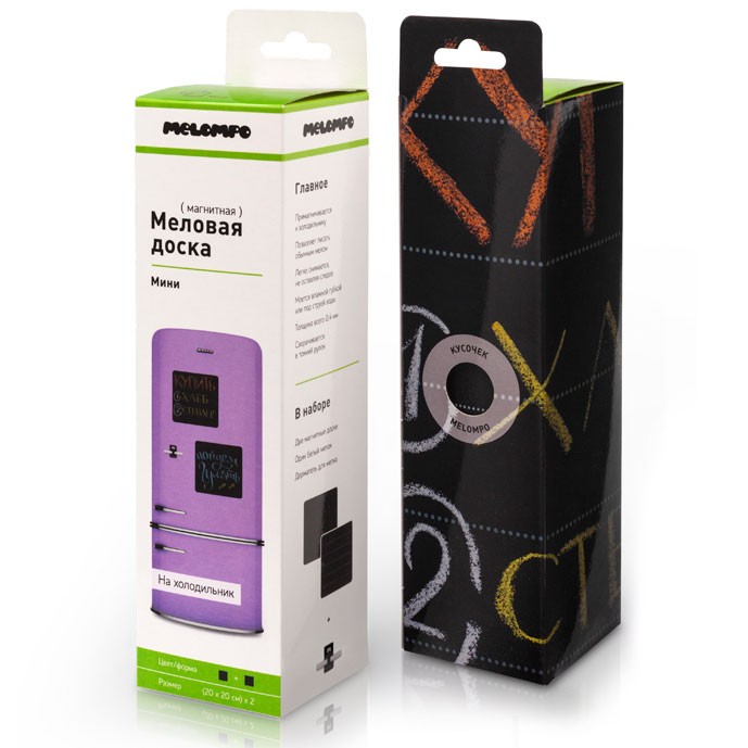 Упаковка красивая, на подарок отличная вещь. На холодильнике держится отлично, на дверях металлических тоже. Мелка хватит на долго:) пишет нормально, стирается мокрой тряпкой. Во общем как в школе доски)