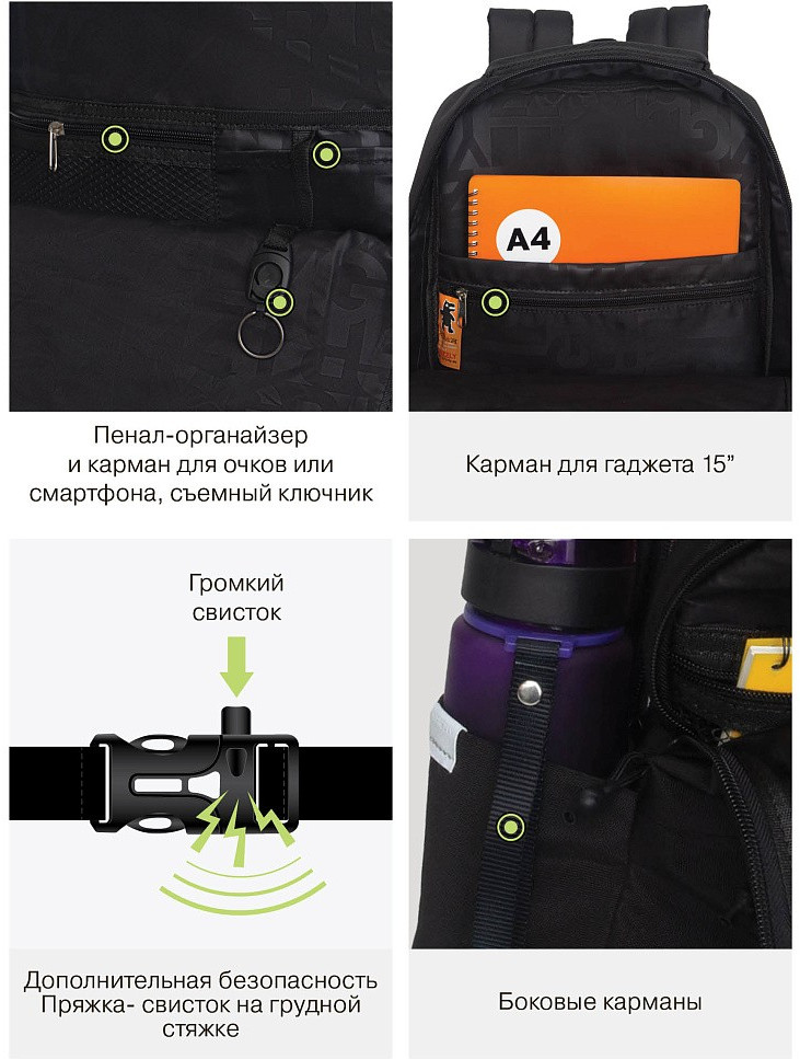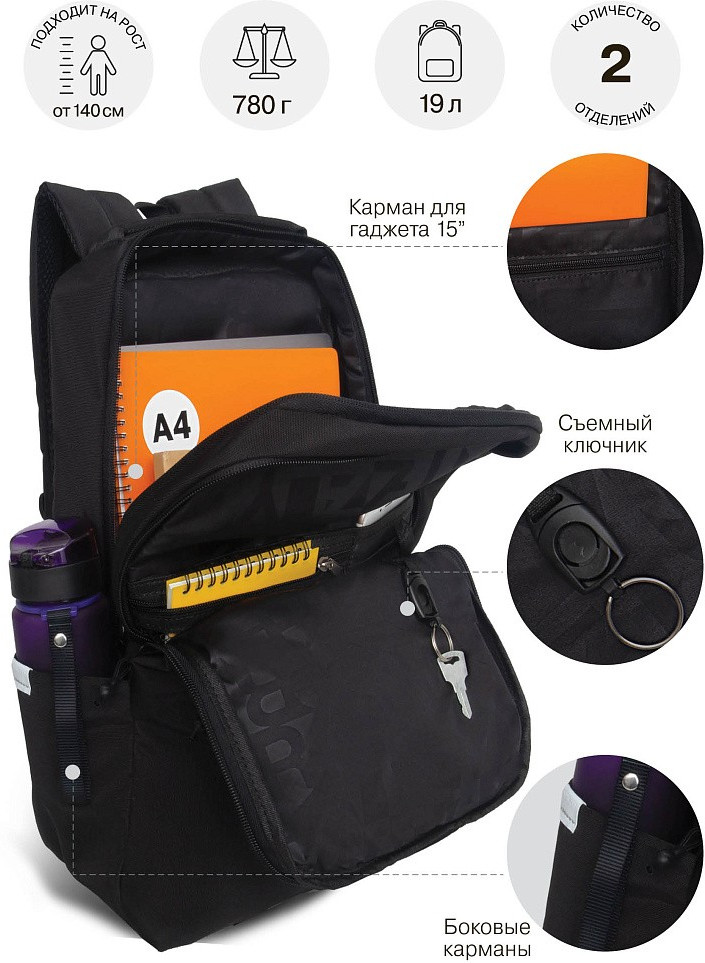 Эта модель рюкзака рассчитана на рост от 140 см. Модель сумки очень вместительная. Подходит всем, кто ежедневно носит с собой принадлежности: школьникам, студентам, спортсменам, любителям путешествий и не только! Мы сделали очень стильный минималистический дизайн. Рюкзаки подходят практически к любым стилям одежды: деловому, спортивному, классическому. Прекрасно гармонируют как с кроссовками так и с туфлями. За счет водо- и грязеотталкивающей пропитки портфели долго остаются как новые. Если ранец все же чем-то испачкался, мы рекомендуем ручную стирку в холодной воде при температуре не выше 30 градусов и без использования отжима. Общий объем сумки (19 л) разделен на два отделения. Одно подходит для крупных вещей (сменной одежды, спортивной формы или обуви). Второе — для ноутбука до 15″, планшета и документов формата А4 в папке, учебников, рабочих тетрадей. В кармашки можно класть различные полезные мелочи. Имеются 3 кармана снаружи и карманы внутри. Помещаются все необходимые вещи: проездной, смартфон, кошелек или ключи. Также отлично вместят в себя пенал с канцелярскими принадлежностями. У рюкзака анатомические спинка и лямки. Есть нагрудная стяжка со свистком. Его удобно носить и фиксировать даже в холодное время года на теплой объемной одежде. Благодаря поддержке позвоночника, меньше устает спина, равномерно распределяется нагрузка с поясничного отдела по позвоночнику. Светоотражающие элементы с четырех сторон создают дополнительную безопасность в условиях недостаточной видимости.