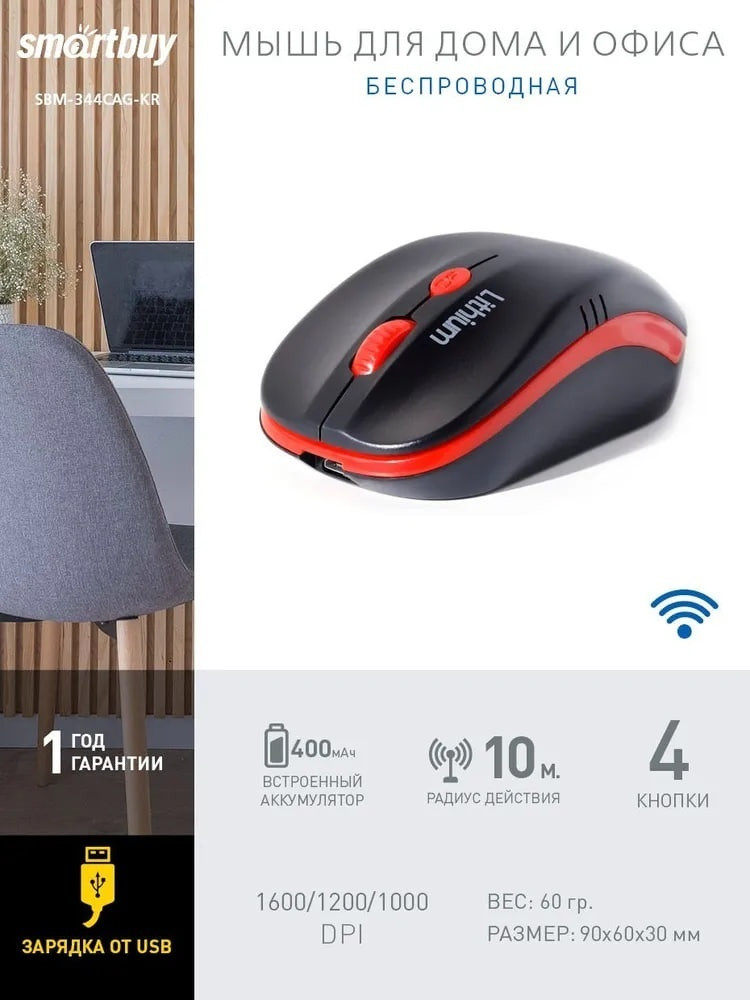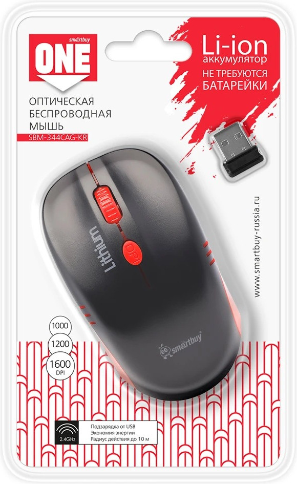 Модель SBM-344CAG имеет встроенный аккумулятор объёмом 350 мАч, тем самым исключает хлопоты, связанные со сменой батареек. Высокоточный оптический сенсор имеет 3 настройки DPI 800/1200/1600, вы сами сможете подобрать нужную скорость курсора. В комплект входит кабель microUSB для зарядки. Во время зарядки индикация горит синим цветом. При 100% заряде индикатор гаснет. Помимо автоматического отключения питания при бездействии, модель имеет переключатель питания на нижней стороне, можно не бояться переносить мышь в сумке или рюкзаке. Модель имеет симметричную форму, можно использовать как правой, так и левой рукой.