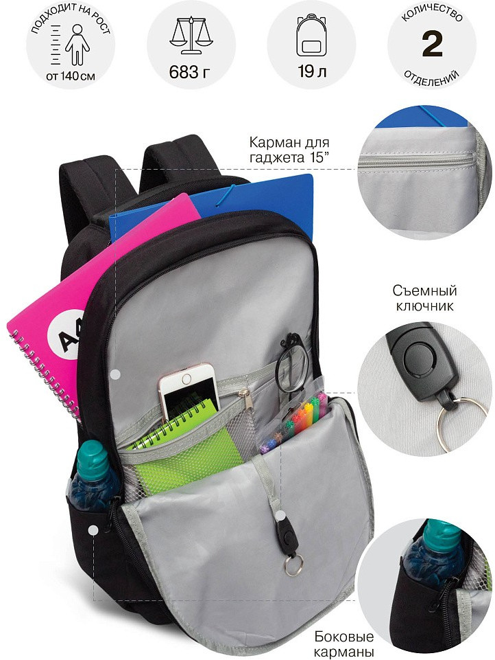 Эта модель рюкзака рассчитана на рост от 140 см. Модель сумки очень вместительная. Подходит всем, кто ежедневно носит с собой принадлежности: школьникам, студентам, спортсменам, любителям путешествий и не только! Мы сделали очень стильный минималистический дизайн. Рюкзаки подходят практически к любым стилям одежды: деловому, спортивному, классическому. Прекрасно гармонируют как с кроссовками так и с туфлями. За счет водо- и грязеотталкивающей пропитки портфели долго остаются как новые. Если ранец все же чем-то испачкался, мы рекомендуем ручную стирку в холодной воде при температуре не выше 30 градусов и без использования отжима. Общий объем сумки (19 л) разделен на два отделения. Одно подходит для крупных вещей (сменной одежды, спортивной формы или обуви). Второе — для ноутбука до 15″, планшета и документов формата А4 в папке, учебников, рабочих тетрадей. В кармашки можно класть различные полезные мелочи. Имеются 3 кармана снаружи и карманы внутри. Помещаются все необходимые вещи: проездной, смартфон, кошелек или ключи. Также отлично вместят в себя пенал с канцелярскими принадлежностями. У рюкзака анатомические спинка и лямки. Есть нагрудная стяжка со свистком. Его удобно носить и фиксировать даже в холодное время года на теплой объемной одежде. Благодаря поддержке позвоночника, меньше устает спина, равномерно распределяется нагрузка с поясничного отдела по позвоночнику. Светоотражающие элементы с четырех сторон создают дополнительную безопасность в условиях недостаточной видимости.