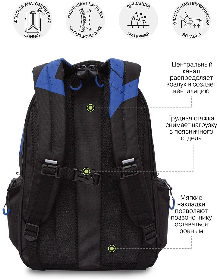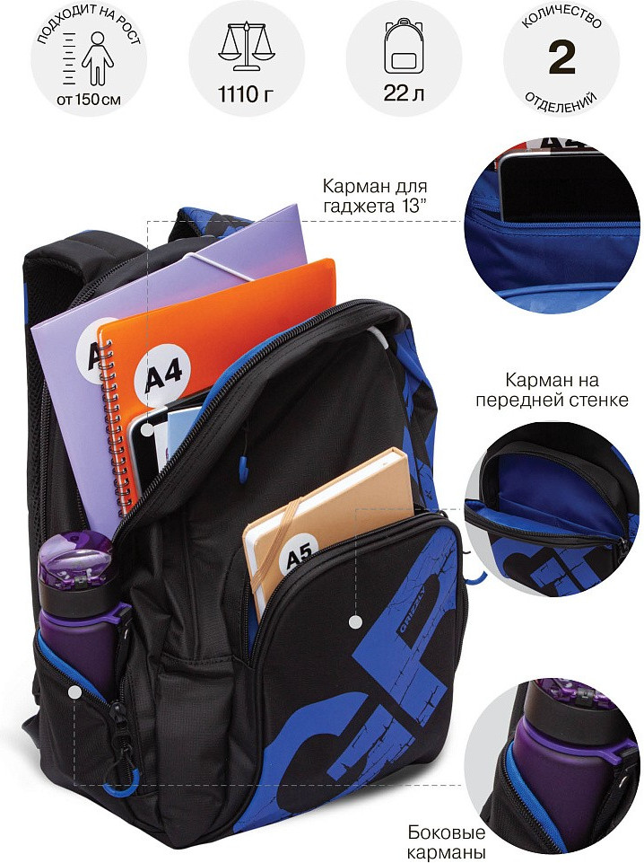 Много отделений, качество супер, мой сын рост 167, подросток 14 лет в восторге, очень доволен, есть твёрдое дно, которое вшито в ткань его можно поднять или спустить на дно. Ткань верха плотная, замки крупные удобные, нам все понравилось брала