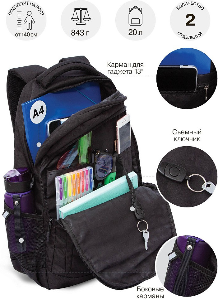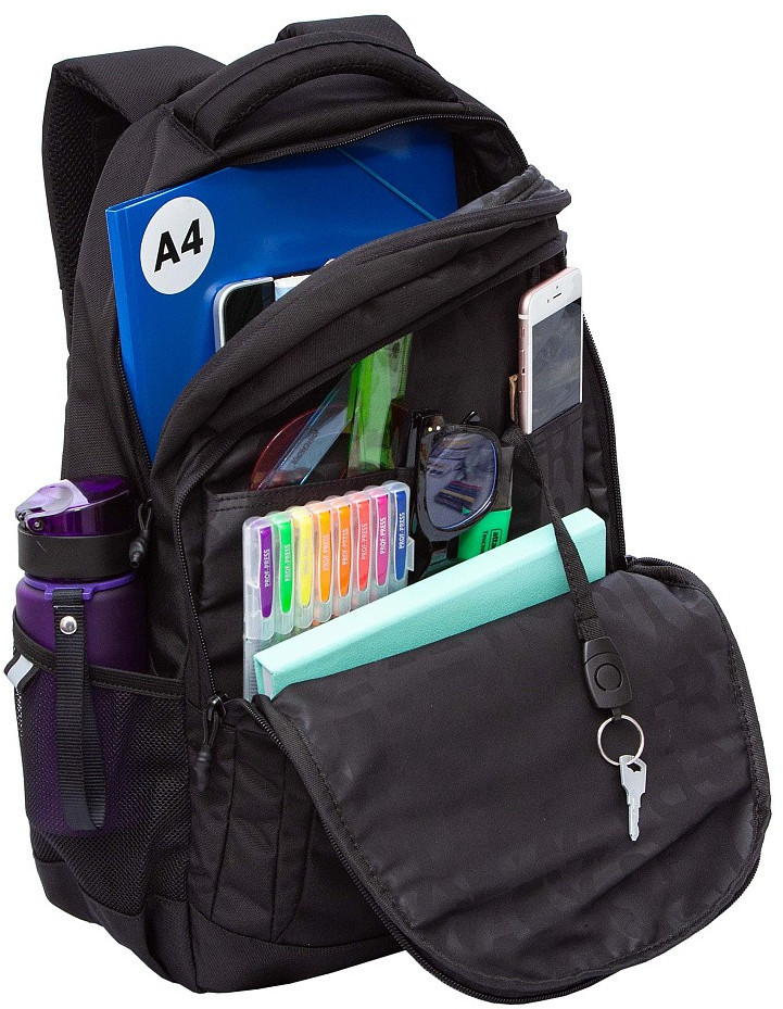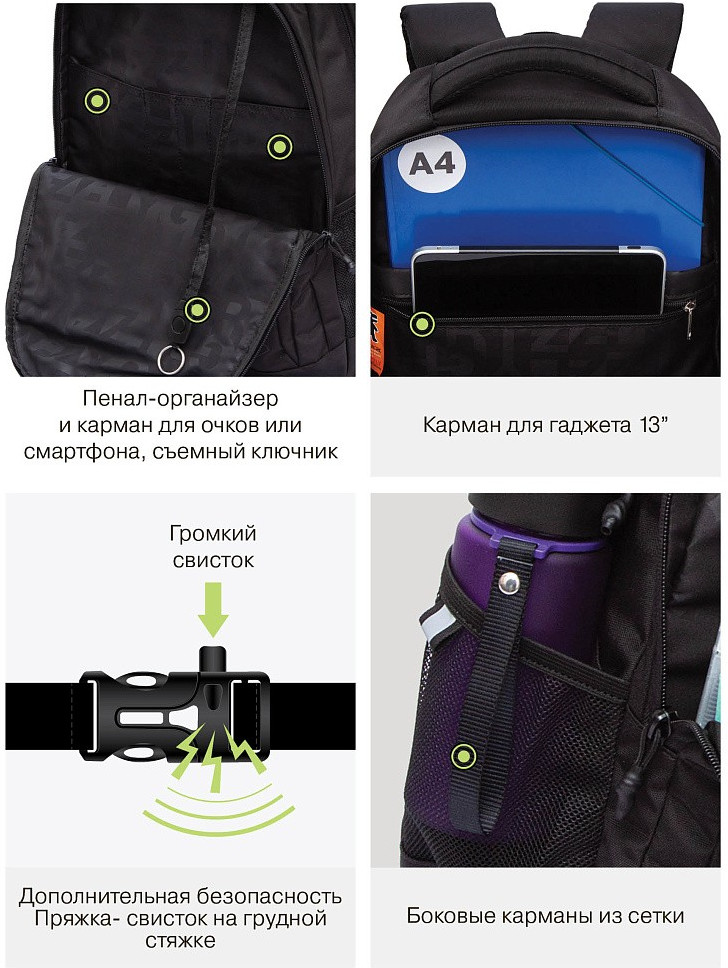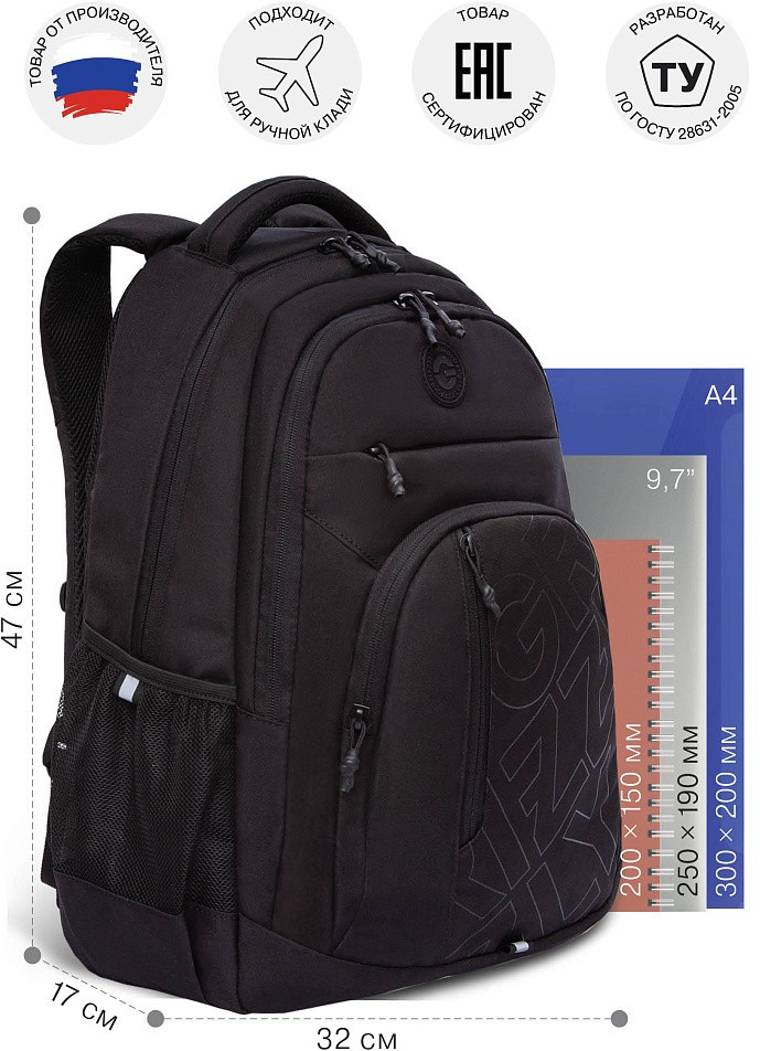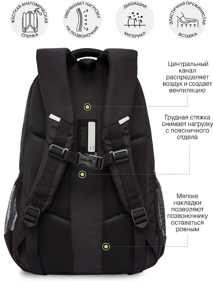 Подростку приходится носить с собой в школу столько вещей, что не каждый взрослый потянет? Анатомический школьный рюкзак разработанный GRIZZLY помогает сохранить здоровую спину. Эта модель сумки выполнена из прочного полиэстера и рассчитана на рост от 140 до 160 см. Как бы мальчик не разложил вещи внутри, рюкзак отлично держит форму и не перекашивается со временем и от тяжестей. Накладки дышащей анатомической спинки и нагрудная стяжка со свистком поддерживают позвоночник в правильном положении — равномернее распределяется вес, снимая напряжение с поясничной области и равномерно распределяя нагрузку по позвоночнику, не позволяя сутулится и сохраняя правильную здоровую осанку. Портфель вместительный — внутри помещается все, что может понадобиться в школе. Есть два больших отделения: одно для книг, учебников и документов формата А4, другое для тетрадей, и канцелярских принадлежностей. Много карманов внутри и снаружи, карман для ноутбука 13″ или планшета. Сетчатые карманы по бокам вместят в себя разные мелочи или бутылку с водой. Также на карманах есть небольшие светоотражающие вставки-крепления для ключей и брелока, они не останутся незамеченными в темное время суток. Минималистичный внешний вид очень нравится мальчикам. За счет водо- и грязеотталкивающей пропитки рюкзак долго остается как новый. Если он все же чем-то испачкался, мы рекомендуем ручную стирку в холодной воде при температуре 30 градусов без применения отжима. При легких загрязнениях без труда очищается с помощью влажной тряпочки.