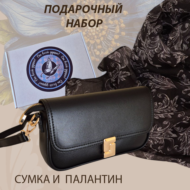 Представляемый подарочный набор состоит из комплекта: классическая сумка универсального черного цвета и яркий палантин, которые безупречно дополняют друг друга. Сумка кросс-боди отличного качества из экокожи имеет стильную металлическую золотистую застежку, что придает ей дорогой вид. Крепко сшита, надежные замки, ровные строчки, добротная фурнитура. Крышка сумки фиксируется магнитом, при этом внутренняя её часть застегивается на металлическую молнию. Внутри сумки предусмотрено три отделения, одно из которых застегивается на молнию. Помимо этого, предусмотрены дополнительные внутренние карманы: один на замке и другой без застежки. Отстёгивающийся плечевой ремень легко регулируется по длине. Такая сумка прослужит долгие годы! Её стиль предусмотрен как для повседневной носки, так и в качестве аксессуара, подчеркивающий вечерний наряд. Палантин соткан из смеси натуральных волокон хлопка и вискозы — он удивительно нежный, легкий и приятный на ощупь. Рисунок палантина имеет классический принт, что позволяет ему подойти не только к сумке из данного набора, но и ко многим вещам гардероба.