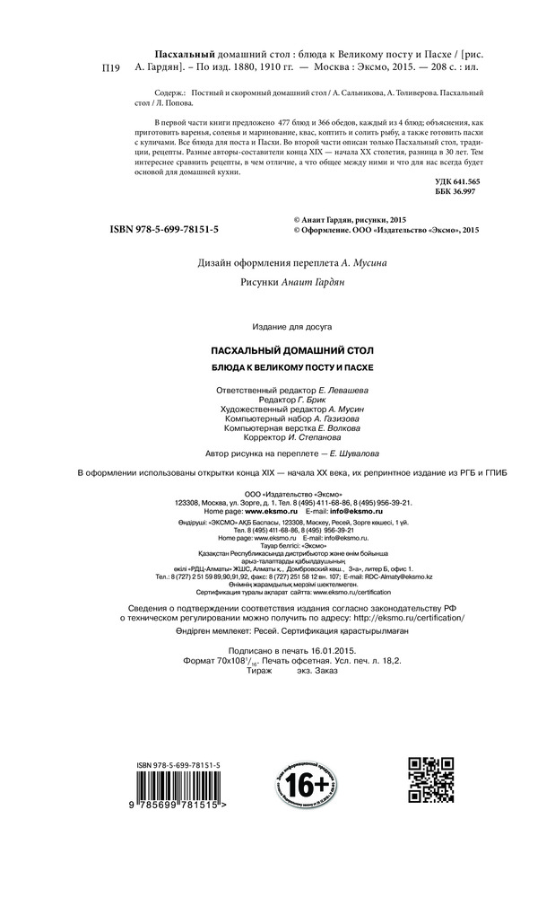 Пасхальный домашний стол. Блюда к Великому посту и ПасхеАлександра Николаевна Толиверова, Анна Никитична Сальникова В данный момент этот товар отсутствует в продаже. Возможно, у нас найдется аналогичный или похожий товар здесь. Серия: Кулинария. Классические издания В первой части книги предложено 477 блюд и 366 обедов, каждый из 4 блюд; объяснения, как приготовить варенья, соленья и маринование, квас, коптить и солить рыбу, а также готовить пасхи с куличами. Все блюда для поста и Пасхи. Во второй части описан только Пасхальный стол, традиции, рецепты. Разные авторы-составители конца XIX начала XX столетия, разница в 30 лет. Тем интереснее сравнить рецепты, в чем отличие, а что общее между ними и что для нас всегда будет основой для домашней кухни. |