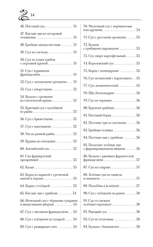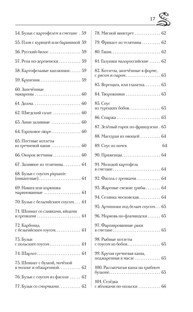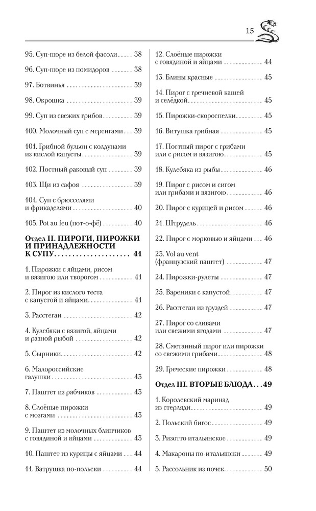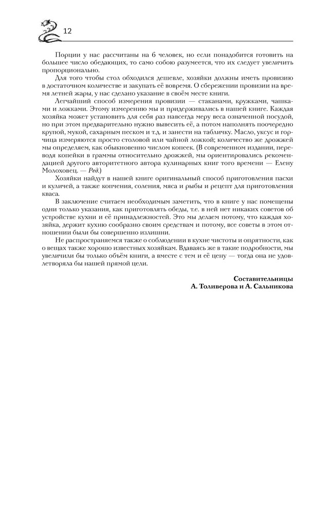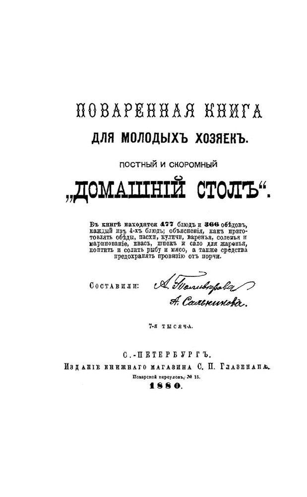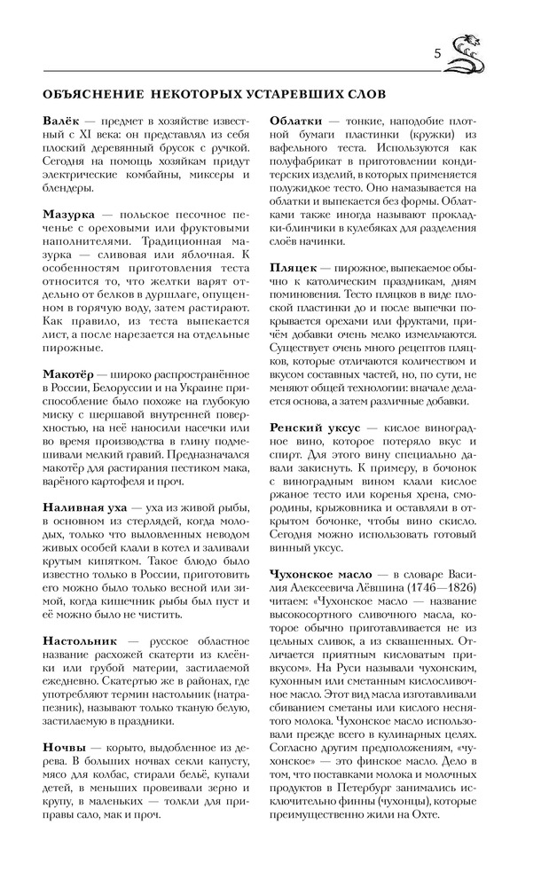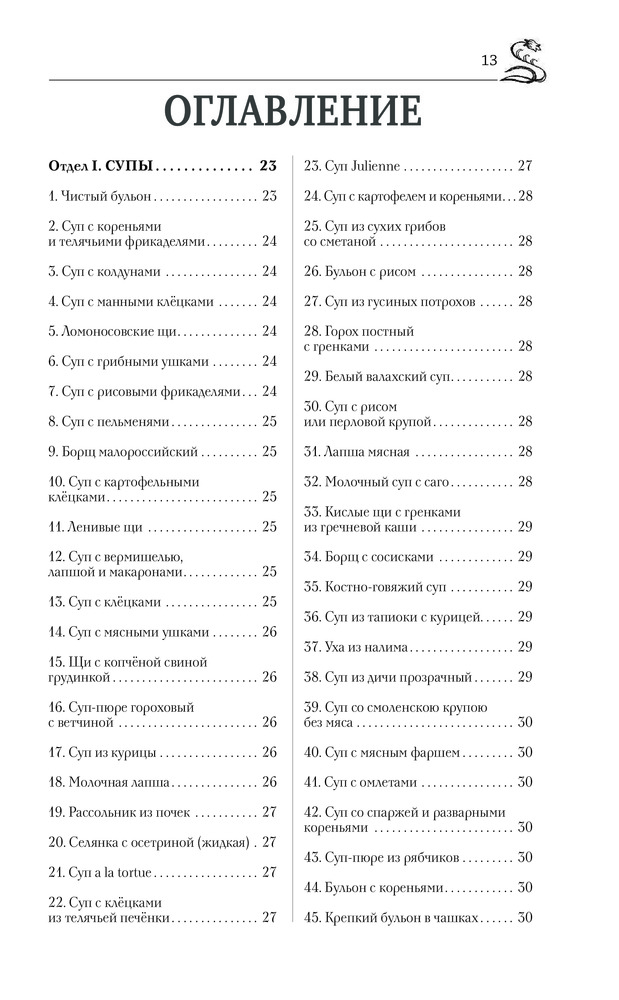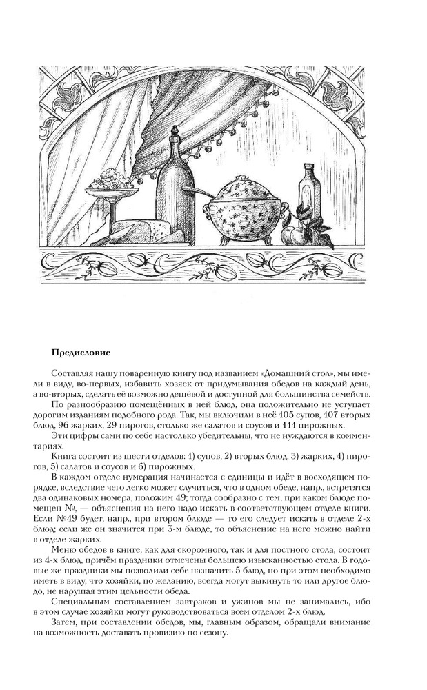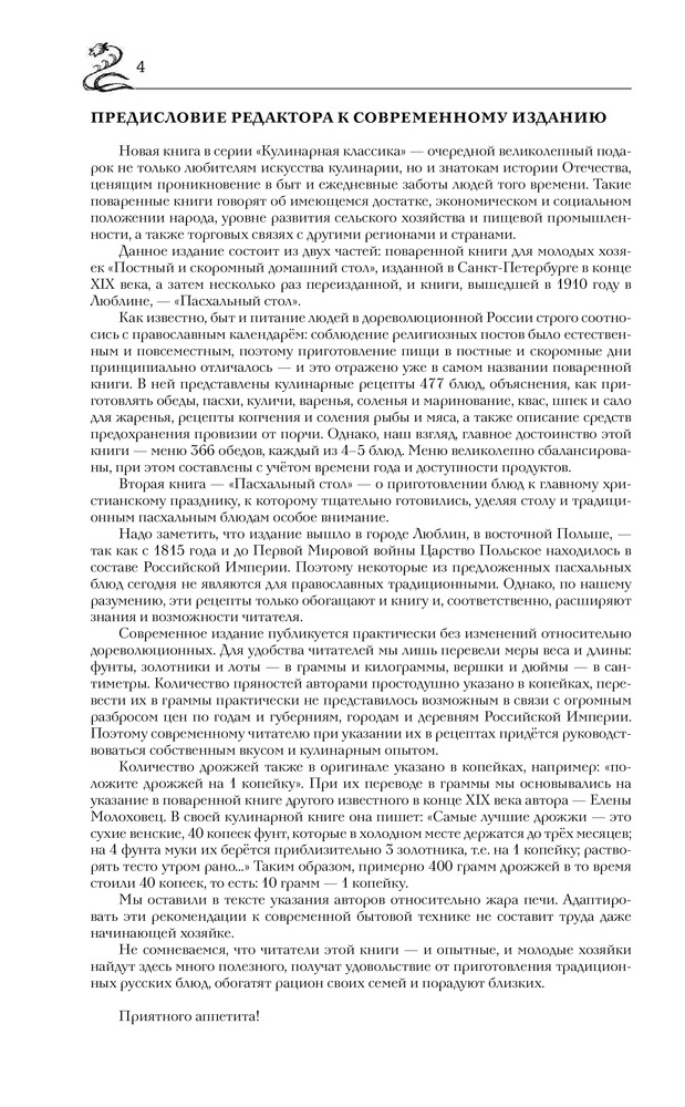 Книга большого формата в хорошем переплете, с закладкой. Напечатана на белой тонкой бумаге, есть цветные вставки со старинными пасхальными открытками. Так как книга со старинными рецептами, есть словарь устаревших кулинарных слов. Содержание: супы, пироги, пирожки и принадлежности к супу, вторые блюда, жаркое, салаты, соусы, маринование и варенья, пирожное, раздел смесь (в нем представлены разные рецепты, куличи, квас, соление сала и рыбы и др.). Раздел расписания обедов представляет собой готовые меню по временам года со ссылками на номер рецепта.