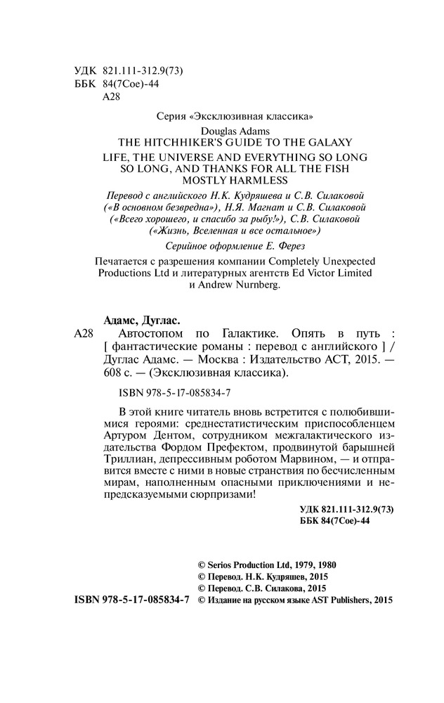 💳 Оплатить за товар можно при получении 🇰🇿 Есть бесплатная доставка по Казахстану от 1 дня 🎁 Копите бонусы с каждой покупки Серия: Эксклюзивная классика В этой книге читатель вновь встретится с полюбившимися героями: среднестатистическим приспособленцем Артуром Дентом, сотрудником межгалактического издательства Фордом Префектом, продвинутой барышней Триллиан, депрессивным роботом Марвином, — и отправится вместе с ними в новые странствия по бесчисленным мирам, наполненным опасными приключениями и непредсказуемыми сюрпризами! |