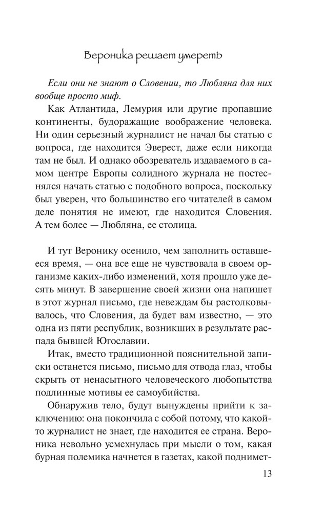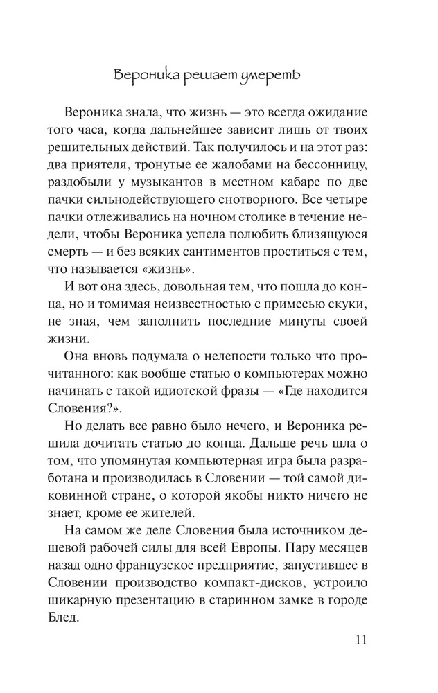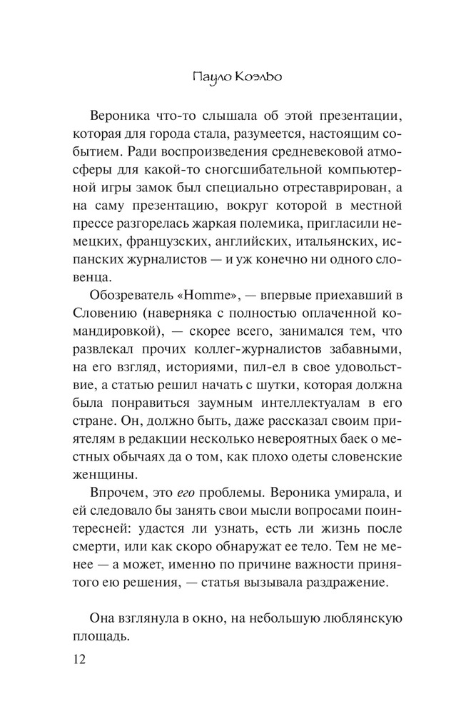 Не являюсь большим любителем творчества Пауло Коэльо, но эта книга показалась мне со смыслом. Согласна с предыдущим отзывом. Как и большинство книг о психиатрических лечебницах, немного тяжелое произведение, но читается, действительно, быстро. Интерес к книге не пропадал на протяжении всего процесса чтения.