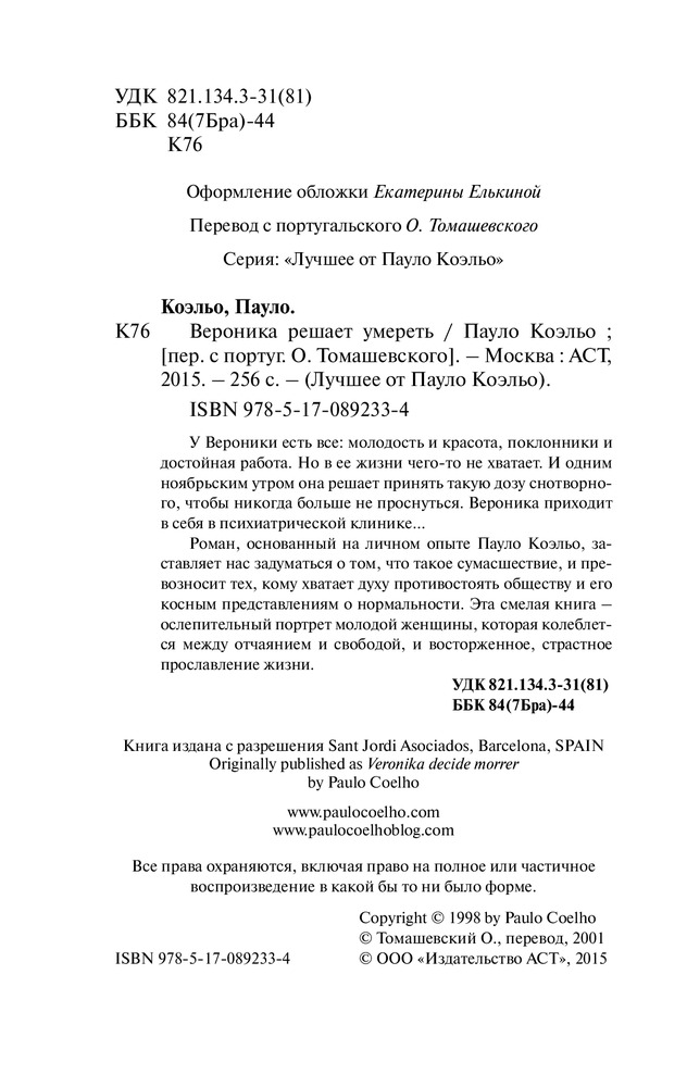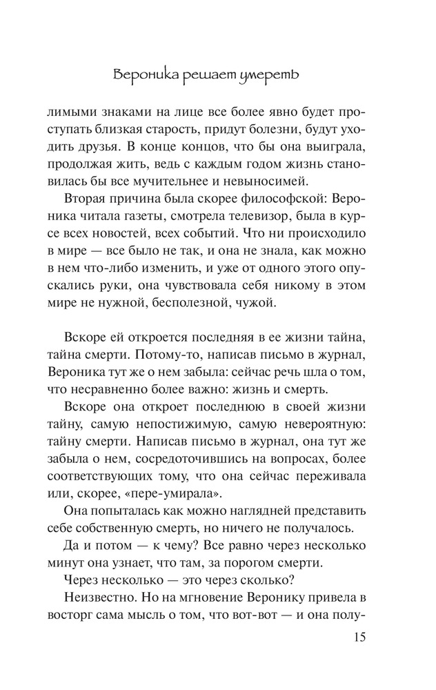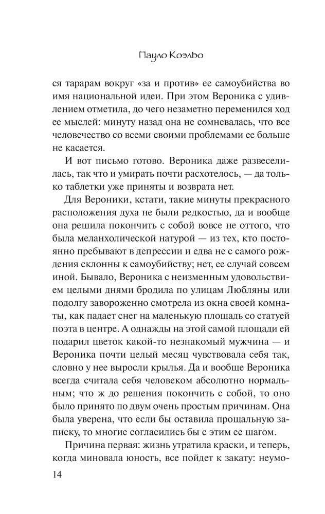 Вероника решает умеретьбыстро читается со смыслом красивое оформление тяжёлое содержание В данный момент этот товар отсутствует в продаже. Возможно, у нас найдется аналогичный или похожий товар здесь. Серия: Лучшее от Пауло Коэльо У Вероники есть все: молодость и красота, поклонники и достойная работа. Но в ее жизни чего-то не хватает. И одним ноябрьским утром она решает принять такую дозу снотворного, чтобы никогда больше не проснуться. Вероника приходит в себя в психиатрической клинике. |