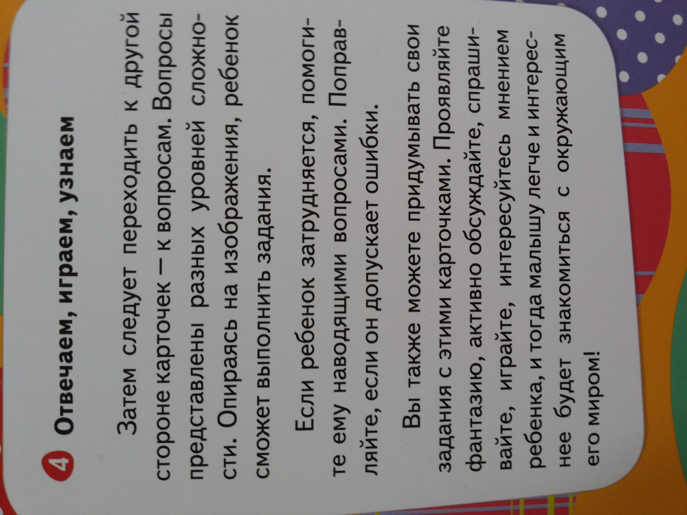 Замечательные карточки! В самый раз для деток и не очень разговорчивых и находчивых родителей (пап). Есть о чём поговорить, благодаря вопросам на обороте карточки (каждой).