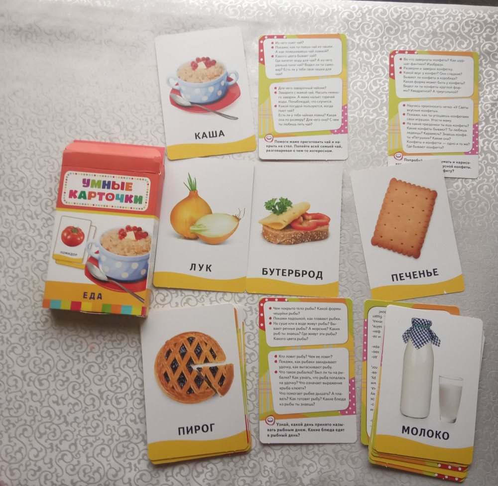 Карточки понравились, яркие и понятные. Сложных для малышей картинок нет (типа экзотических блюд или фруктов). Доставку произвели даже раньше, чем обещали.
