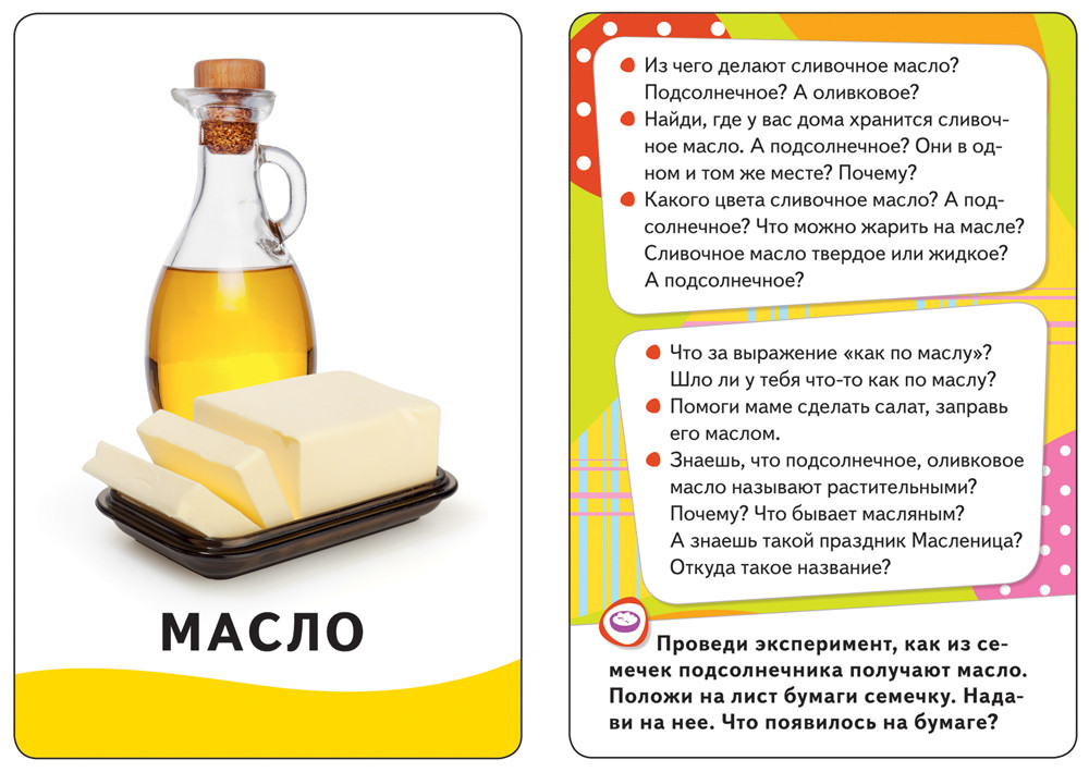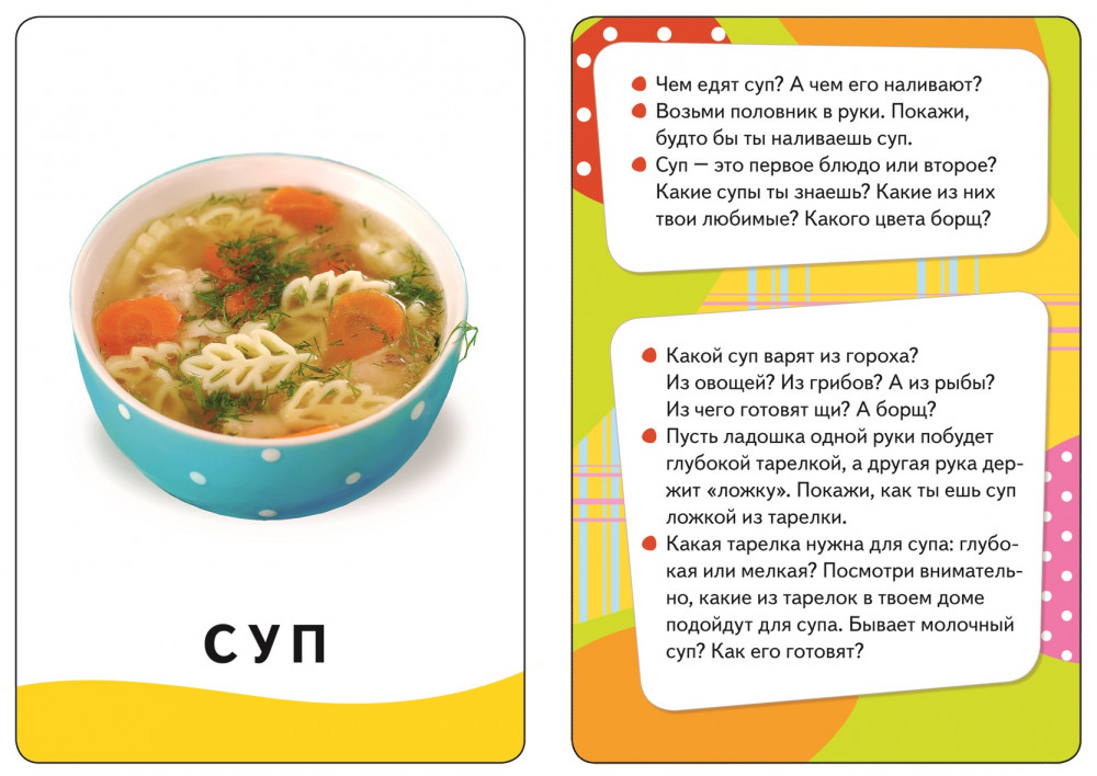 Карточки порадовали. Перечислю что входит: каша, картофельное пюре, суп, творог, бутерброд, яйцо.печенье. хлопья, хлеб, рыба, котлета, масло, салат, мясо, яблоко, сыр, банан, чай, арбуз, варенье, клубника, йогурт, огурец, молоко, помидор, сок, лук, пирог, конфеты, макароны. Как обычно на задней стороне карточки задания.