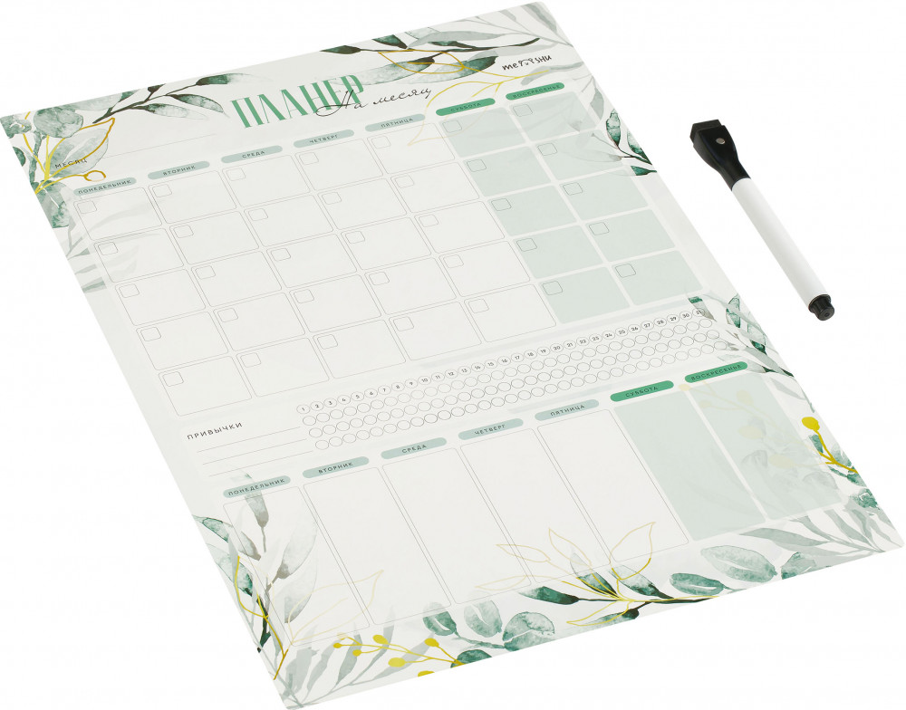 Магнитный многоразовый планер на месяц «Purle» — отличный помощник в организации времени. Большой формат А3 (297×420 мм) идеально подходит для ежедневного планирования. Планер поможет вести расписание, составлять список покупок и личных дел. Помимо календаря, планировщик содержит трекер полезных привычек и дополнительные поля для заметок. Благодаря трекеру проще начать правильно питаться, раньше ложиться спать или учить иностранный язык. Для этого нужно написать цель, а потом отмечать дни, когда удавалось ей следовать. Со временем повторяющееся действие войдёт в привычку.