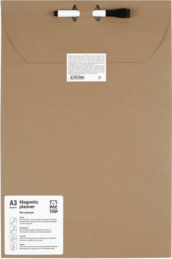 Планер выполнен из картона плотностью 200 г/м2, покрытого магнитным винилом. Ламинация позволяет многократно писать и стирать надписи. В комплект входит чёрный маркер. При помощи губки, которая встроена в колпачок, удобно корректировать записи. Благодаря магниту маркер можно крепить к любой металлической поверхности, в том числе к холодильнику. Планер выполнен в универсальном дизайне, поэтому подходит как взрослым, так и подросткам. Комплект упакован в плотный крафтовый конверт.