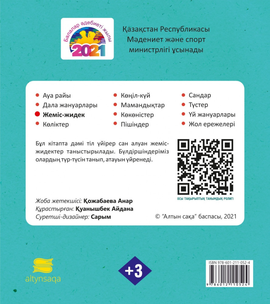 💳 Оплатить за товар можно при получении 🇰🇿 Есть бесплатная доставка по Казахстану от 1 дня 🎁 Копите бонусы с каждой покупки Бұл кітап балаңызға асты нәрлі, ал дастарханды сәнді ететін көкөністерді таныстырады. Бүлдіршіндеріміз көкөністердің түр-түсін танып, атауын үйренеді. Ендеше, бәріміз бірге көкөністердің көркем әлемін шолып шығайық. Смартфонға немесе планшетке Play Market-тен немесе Apple Store-дан кез келген QR code reader бағдарламасын көшіріп алып, тақырыптың тұсындағы QR code-тан аудиосын тыңдауға болады. |