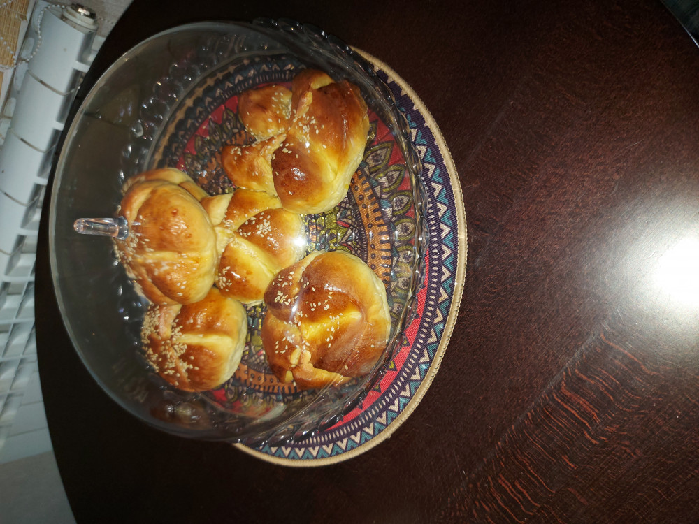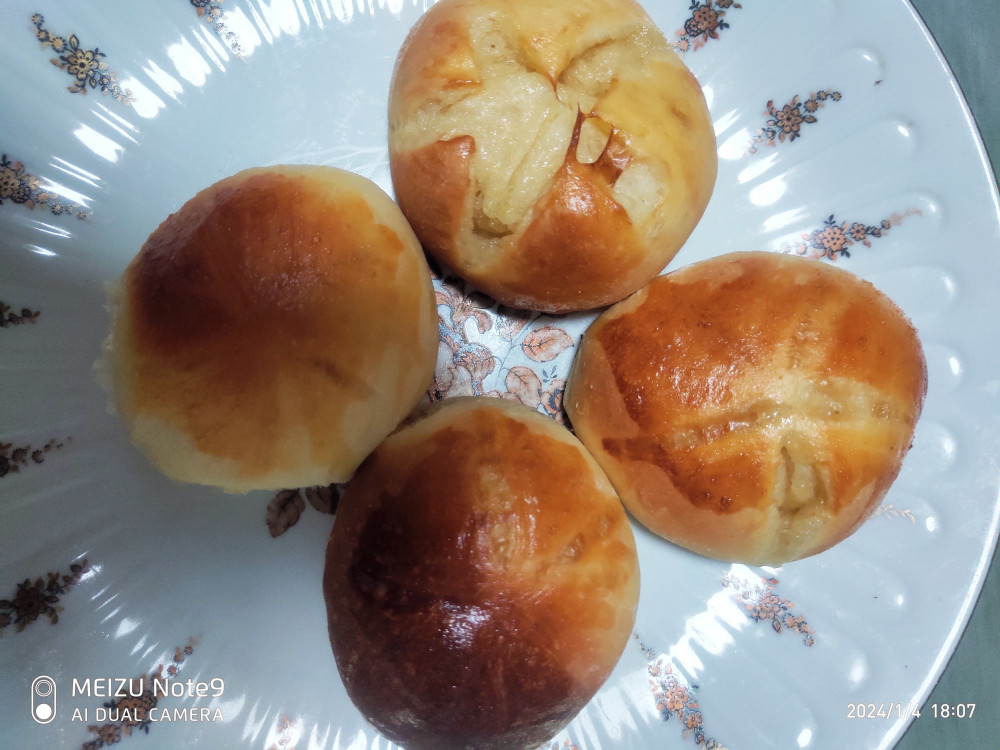 Получаются симпатичные булочки, надо смочить водой, чтобы не прилипало к тесту.