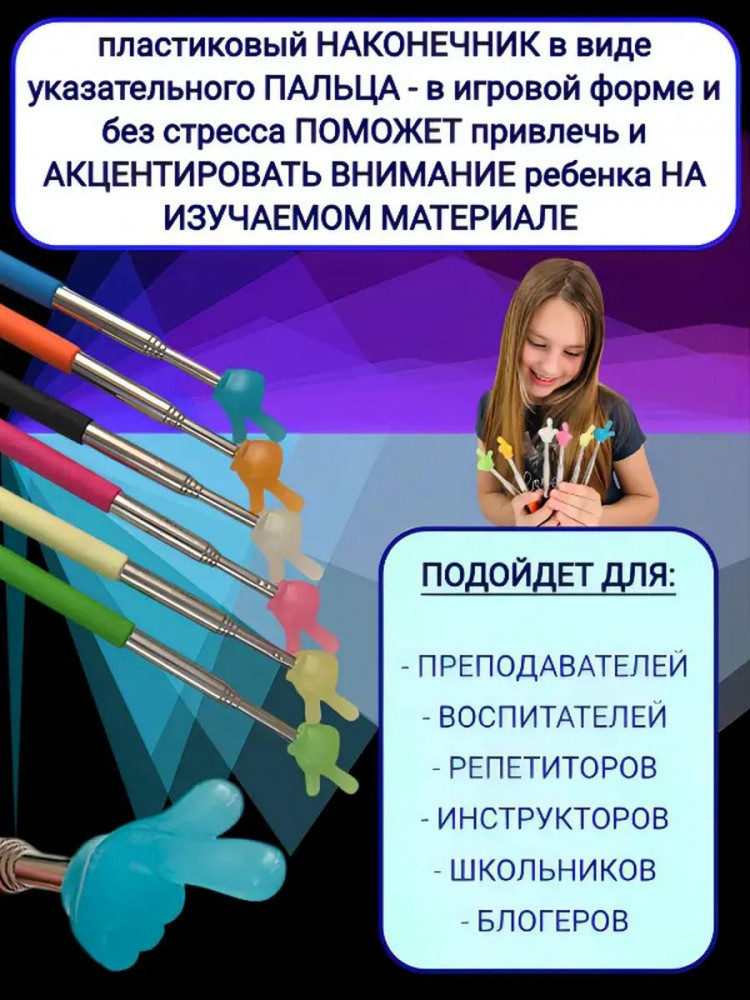 Главной особенностью данной указки является ее регулируемая длина. Вы можете легко установить длину от 21 до 68 см, что позволяет использовать ее в различных ситуациях. Так же фосфорный наконечник-палец светится в темноте. Резиновая ручка обеспечивает надежный хват, исключая вероятность выскальзывания из рук, а легкий пластиковый наконечник в виде пальца делает указку не только функциональной, но и оригинальной. Палец добавляет элемент веселья и делает палочку-указку привлекательной для детей, что делает её отличным аксессуаром для школьных учителей или родительских собраний.