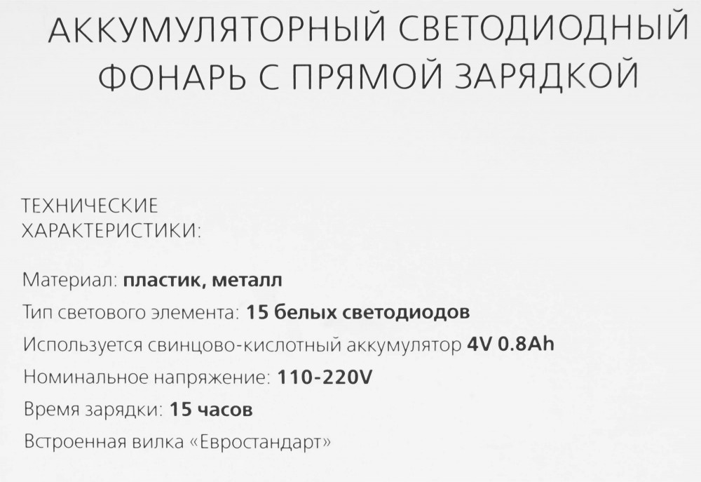 💳 Оплатить за товар можно при получении 🇰🇿 Есть бесплатная доставка по Казахстану от 1 дня 🎁 Копите бонусы с каждой покупки Простой переносной фонарь. Прочный корпус, выполненный из металла и пластика, надежно предохраняет фонарь от повреждений. Тип светового элемента: 15 светодиодов. Используется свинцово-кислотный аккумулятор 4V 0.8 Ah. Встроенная вилка «Евростандарт». До 10 часов непрерывной работы. Время перезарядки 12-15 часов. |