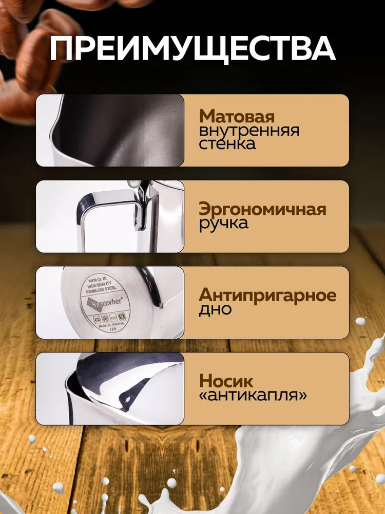 Легкость в уходе и простота в использовании делают молочник идеальным выбором как для домашнего, так и для профессионального использования в кафе и ресторанах. Питчер-молочник — это отличный подарок для всех, кто ценит качественную кухонную утварь и хочет повысить свои навыки в приготовлении кофе. Добавьте в своё утреннее наслаждение каплю комфорта и стиля с питчером из нержавеющей стали — он станет незаменимым помощником в процессе создания уютных моментов в вашей жизни.