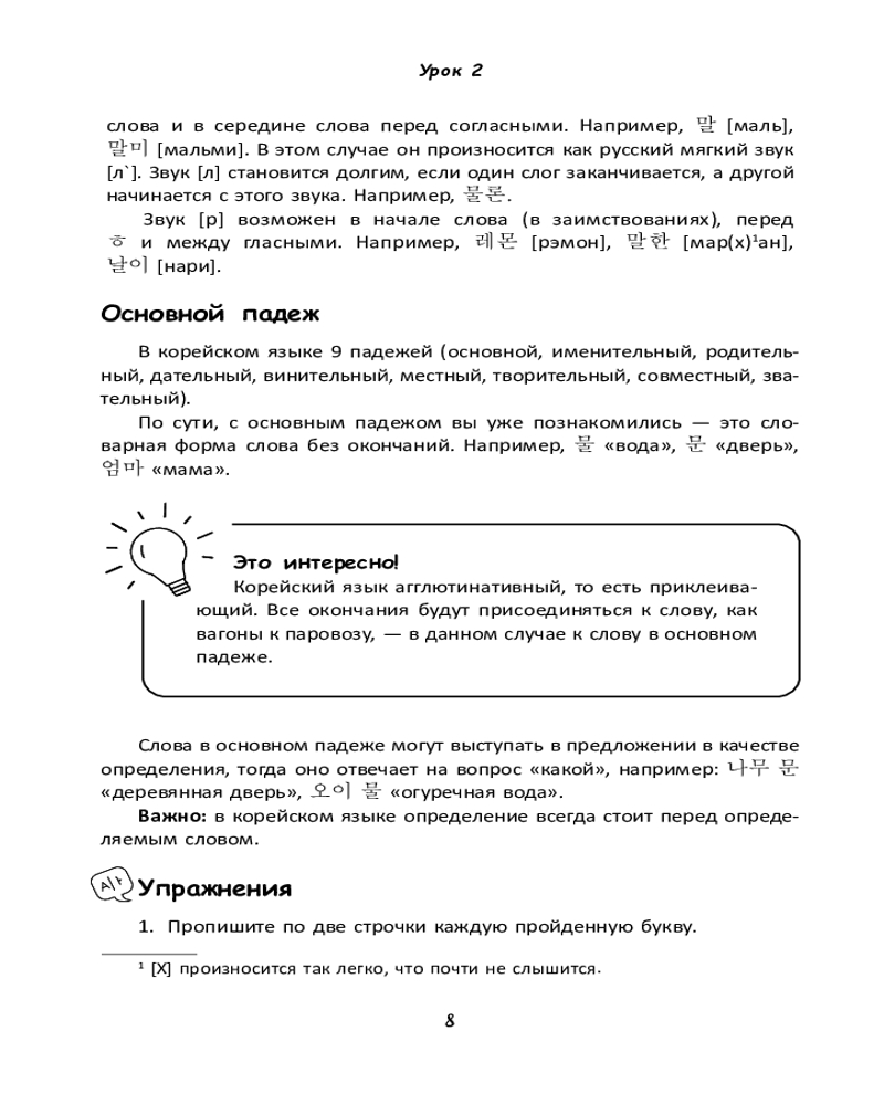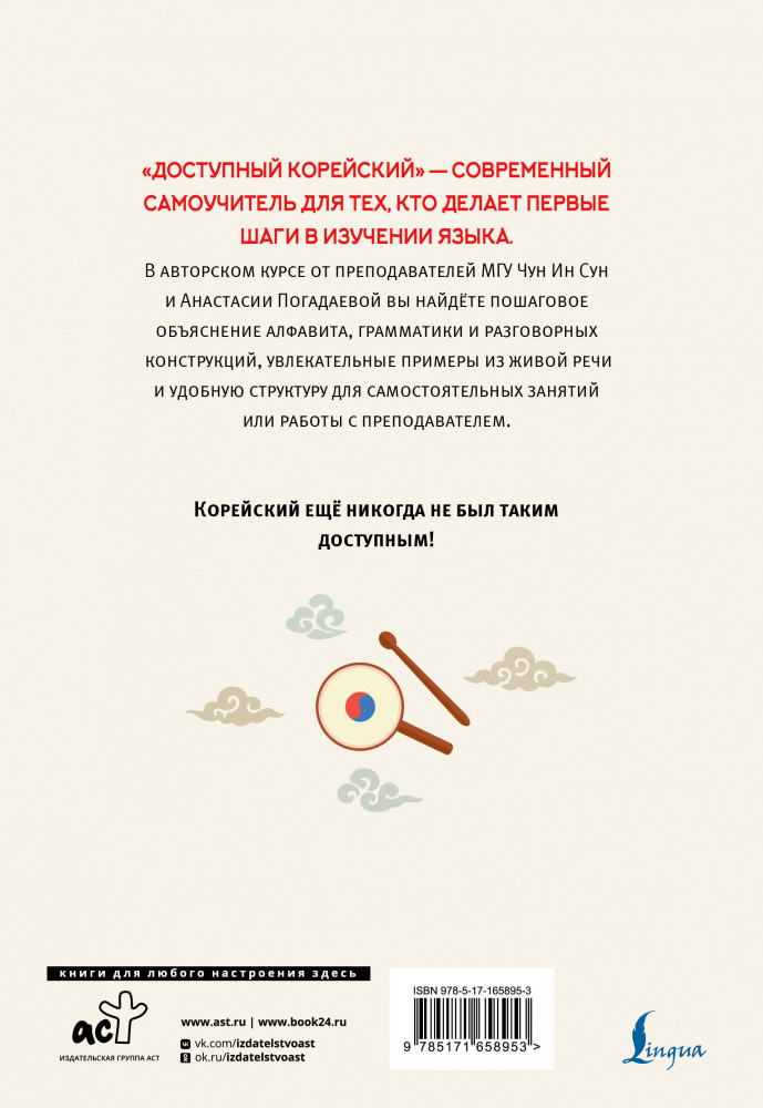 💳 Оплатить за товар можно при получении 🇰🇿 Есть бесплатная доставка по Казахстану от 1 дня 🎁 Копите бонусы с каждой покупки Серия: Школа корейского языка «Доступный корейский» — это современный самоучитель для тех, кто делает первые шаги в изучении языка. Основан он на авторском курсе преподавателей ИСАА МГУ Чун Ин Сун и Анастасии Погадаевой. Материал подаётся чётко, последовательно и с акцентом на живую речь: здесь объясняется всё — от алфавита до сложных грамматических конструкций. |