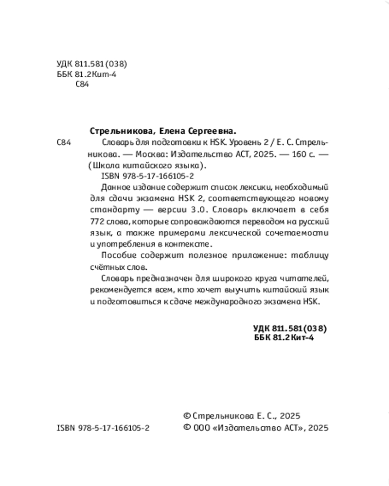 💳 Оплатить за товар можно при получении 🇰🇿 Есть бесплатная доставка по Казахстану от 1 дня 🎁 Копите бонусы с каждой покупки Серия: Школа китайского языка Данное издание содержит список лексики, необходимый для сдачи экзамена HSK 2, соответствующего новому стандарту — версии 3.0. Словарь включает в себя 772 слова, которые сопровождаются переводом на русский язык, а также примерами лексической сочетаемости и употребления в контексте. Пособие содержит полезное приложение: таблицу счётных слов. Словарь предназначен для широкого круга читателей, рекомендуется всем, кто хочет выучить китайский язык и подготовиться к сдаче международного экзамена HSK. |