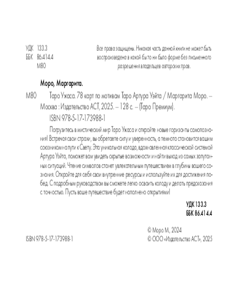 💳 Оплатить за товар можно при получении 🇰🇿 Есть бесплатная доставка по Казахстану от 1 дня 🎁 Копите бонусы с каждой покупки Серия: Таро премиум Разгадайте тайны тьмы, встречайте свои страхи и ужасы лицом к лицу и осветите себе выход из темноты. Ваш свет на пути из тьмы — Таро Ужаса. Самая темная сторона классической колоды Таро Уэйта обратит ваше внимание на скрытое, на опасность, о которой вы не догадываетесь, о ловушках судьбы и предательствах. Читайте символы, выстраивайте ассоциации — смотрите дальше и глубже, доберитесь до самой сути... Откройте свои сильные стороны внутри своих страхов, добивайтесь побед и просчитывайте действия на пять ходов вперед. В комплекте: колода Таро на основе классической системы Артура Уэйта с дополнительными символами и толкованиями и подробное руководство, которое поможет освоить колоду и делать предсказания точнее. |