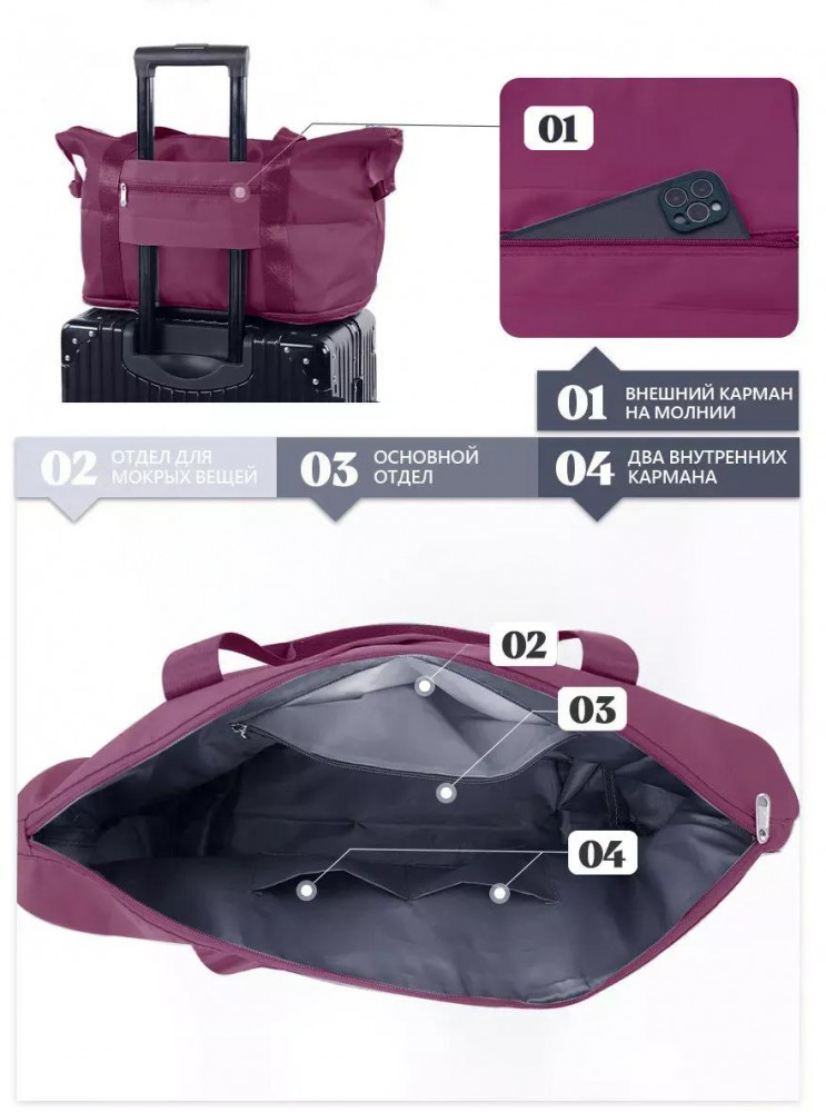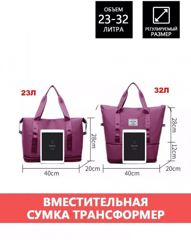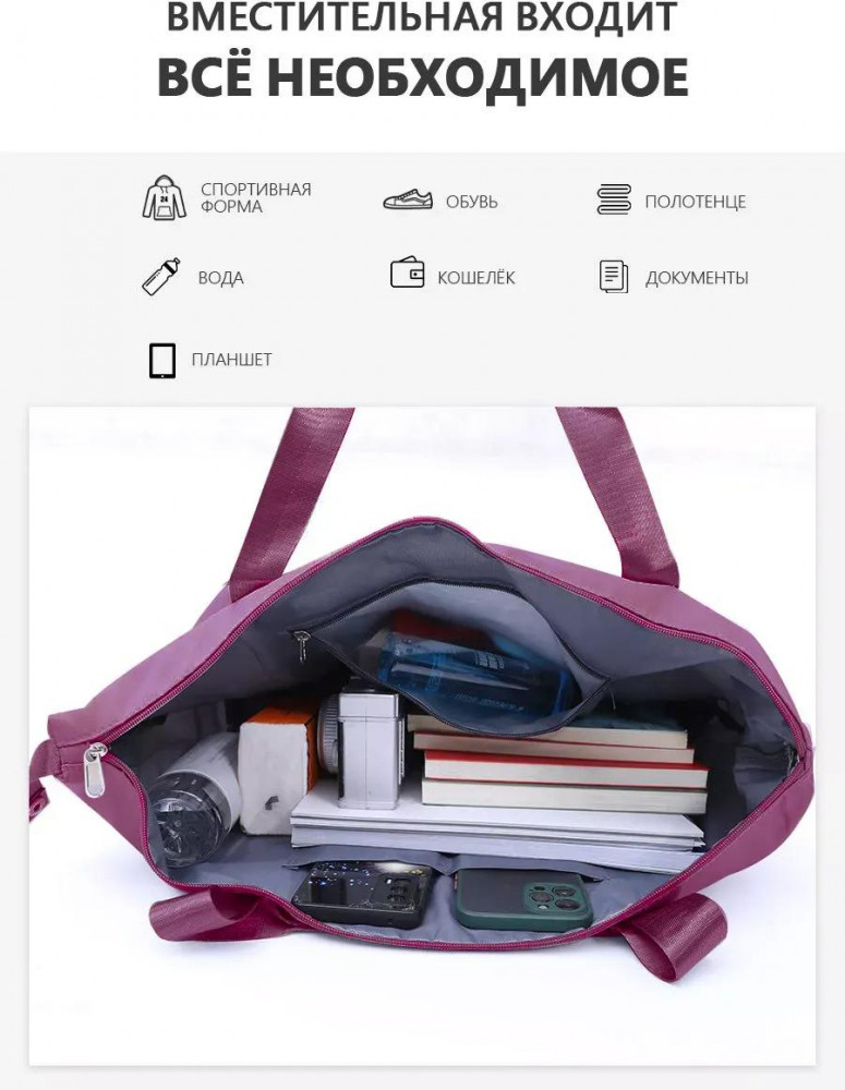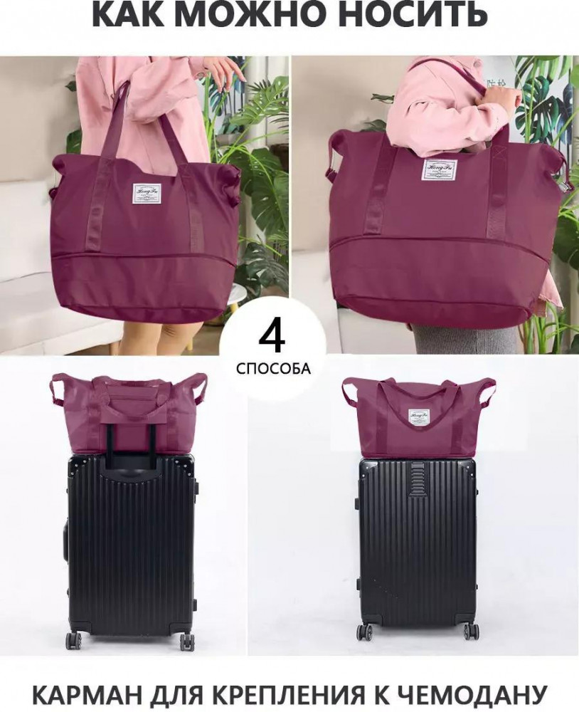 Эту дорожную сумку можно использовать как ручную кладь, спортивную или повседневную. Она недорогая и вместительная, легкая и складная. Отлично подойдет для использования как шоппер, для покупок в магазинах и торговых центрах или для счастливого похода в роддом. Эта сумочка с увеличивающимся дном, её можно брать для поездок в виде багажа во время любых путешествий, на пляж, на фитнес, на плавание или йогу, для занятий любым видом спорта. По габаритам подойдет для всех авиалиний. Можно носить на руках и как сумку через плечо, или положить на чемодан с помощью фиксированной ручки и использовать как ручную кладь в самолете. Изготовлена из легкого, водонепроницаемого, износостойкого и водоотталкивающего материала. У неё очень широкое применение: можно носить в тренажерный зал, в спортзал, на танцы, в бассейн или для покупок. Сверхпрочная ткань, устойчивая к загрязнениям, не требует особого ухода. Ткань с внешней стороны гладкая, матовая и водоотталкивающая. Молния рассчитана на длительный срок службы. Дополнительно имеет внутренний карман для мокрых вещей. Очень простая в уходе, можно стирать в машинке или протереть влажной тряпкой.