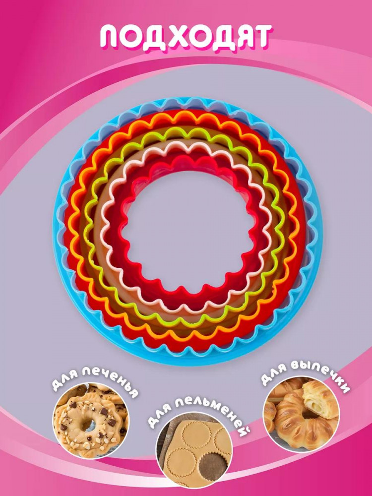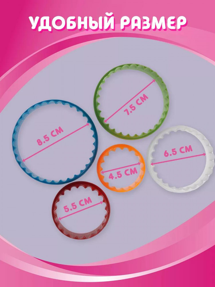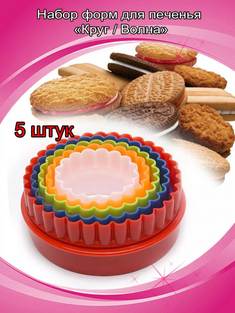 В данный момент этот товар отсутствует в продаже. Возможно, у нас найдется аналогичный или похожий товар здесь. Предлагаем вашему вниманию набор форм для печенья из 5 штук: диаметр формочек — 9 см, 8 см, 6,7 см, 5,5 см и 4 см. Изделия выполнены из прочного, нетоксичного пластика в цвете МИКС. Формы подходят для вырезания сахарного и сдобного печенья, имбирных пряников, мастики, марципана, шоколада, а также хлеба, сыра и бутербродов.