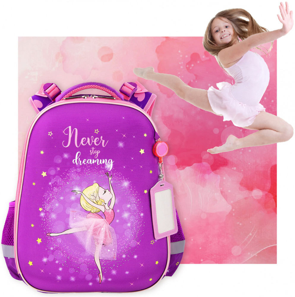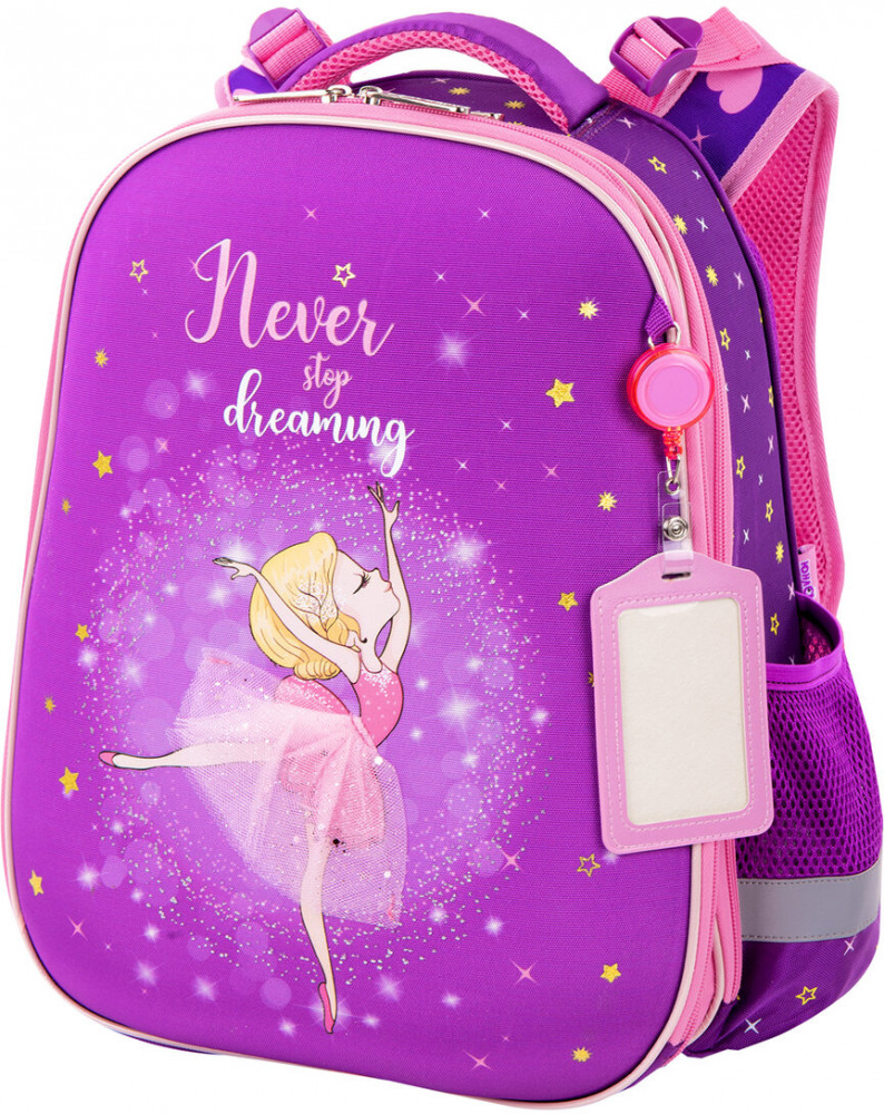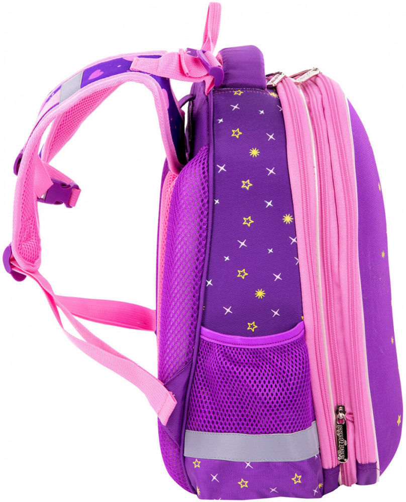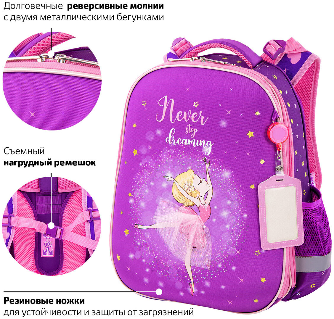 Изготовлен из легкого, формоустойчивого, экологичного материала EVA, с качественной и яркой печатью, различными эффектами. На передней панели дизайн дополнен аппликацией из фатина с блестками. Ранец покрыт высококачественной сатиновой тканью. Имеет гладкую, шелковистую лицевую поверхность. Регулируемые по длине и высоте лямки, можно оптимально подогнать под комплекцию ребенка, чтобы ранец носился с комфортом, несмотря на зачастую избыточный вес содержимого — учебников, тетрадей, канцтоваров. Регулировка позволит использовать ранец не один год! Съемные нагрудные ремешки помогают равномерно распределять нагрузку на спину.