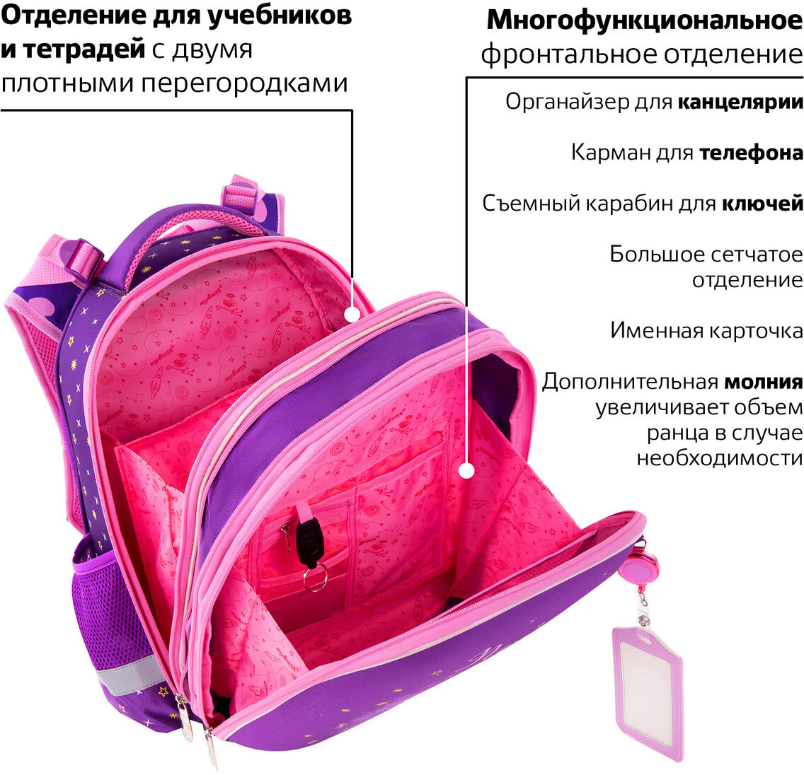 Удобная мягкая вентилируемая спинка с воздушными спонжевыми панелями разработана с учетом анатомических особенностей детей младшего школьного возраста. При правильной регулировке ранец будет практически не ощущаться на плечах и не будет доставлять дискомфорт при носке. В процессе эксплуатации равномерное распределение нагрузки позволит сохранить правильную осанку! В основном отделении ранца можно легко и быстро разместить учебники и тетради между плотными перегородками. Внутри фронтального отделения находится органайзер для канцтоваров, именная карточка, карман для телефона, карабин для ключей и большое отделение из сетки. Такая организация пространства поможет держать принадлежности в сохранности и приучить ребенка к порядку. Ранец широко раскрывается, повышая удобство использования, а за счёт боковых перегородок содержимое не выскользнет из ранца.