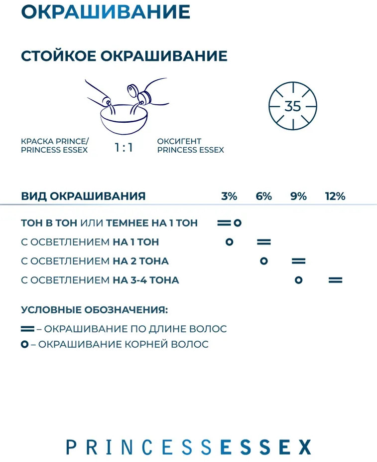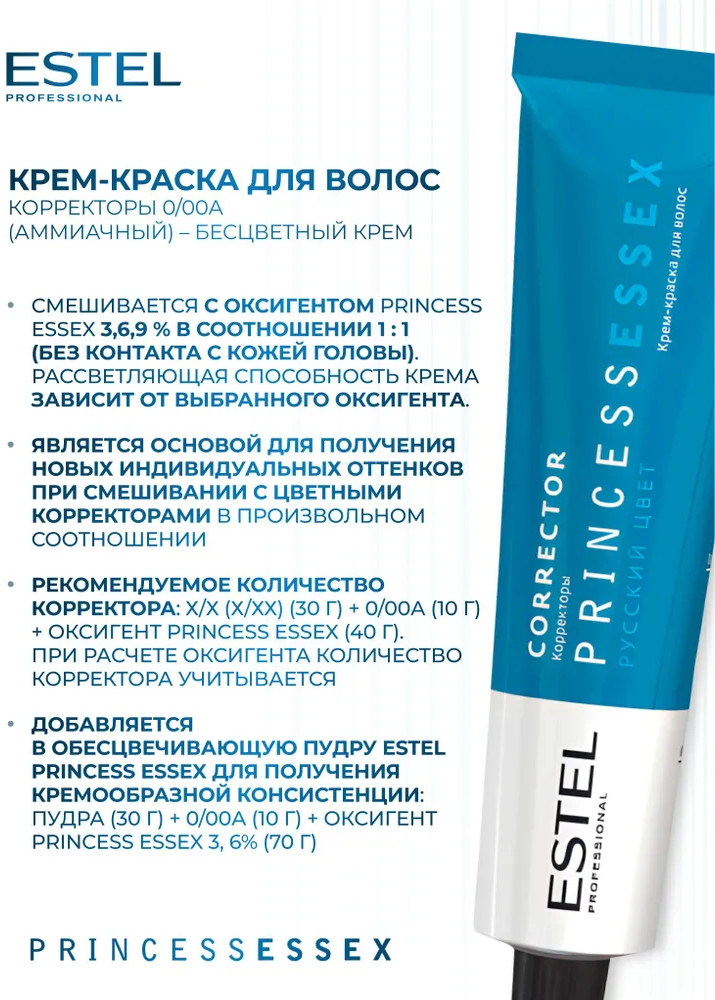 Для нейтрализации цветового нюанса или уплотнения цвета количество оксигента на корректор не рассчитывается. Для усиления яркости цвета количество оксигента на количество корректора рассчитывается. Рекомендуемое количество корректора: Х/Х (Х/ХХ) (30 г) + 0/ХХ (1-10 г) + оксигент ESSEX. В случае использования корректора как самостоятельного красителя на осветленной базе, выбранный цвет смешивается с оксигентом ESSEX 3% в пропорции 1:1 или с активатором ESSEX 1,5% в пропорции 1:2.