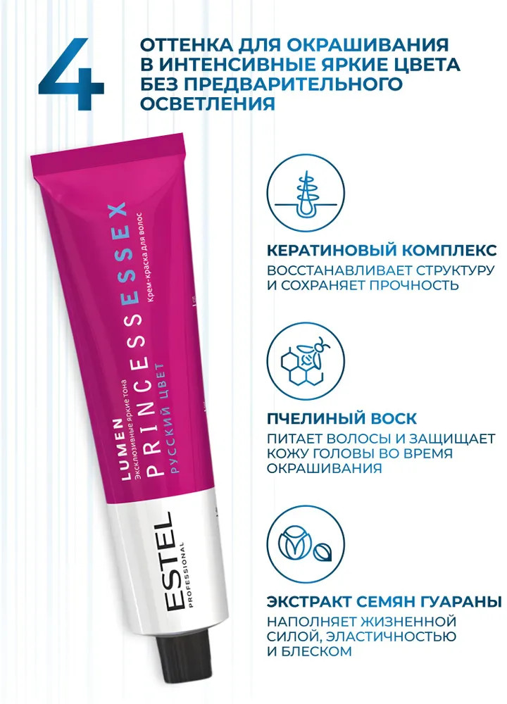Крем-краска Estel Princess Essex создана для модного стойкого окрашивания. Позволяет с лёгкостью создавать красивые оттенки, бережно заботится о волосах во время процедуры, обеспечивает идеальное покрытие седины и гарантирует 100% попадание в тон. Насыщая волосы цветом, делает их более эластичными и блестящими за счёт системы ухода Vivant system. Как работает Vivant system? Кератиновый комплекс — способствует структурному восстановлению волос. Пчелиный воск — питает волосы и бережно воздействует на кожу головы. Экстракт семян гуараны — наполняет волосы жизненной силой, эластичностью и блеском.