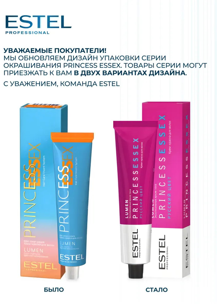 Информируем об изменении дизайна упаковок линейки Princess Essex от Estel Professional. Продукция в обновленном дизайне будет появляться в продаже постепенно: в переходный период возможно наличие товаров как в новом, так и в старом дизайне. Смена внешнего вида не влияет на качество, дозировку, состав и свойства продуктов.