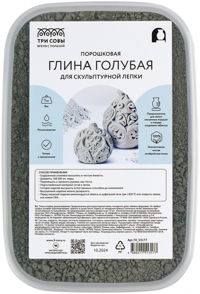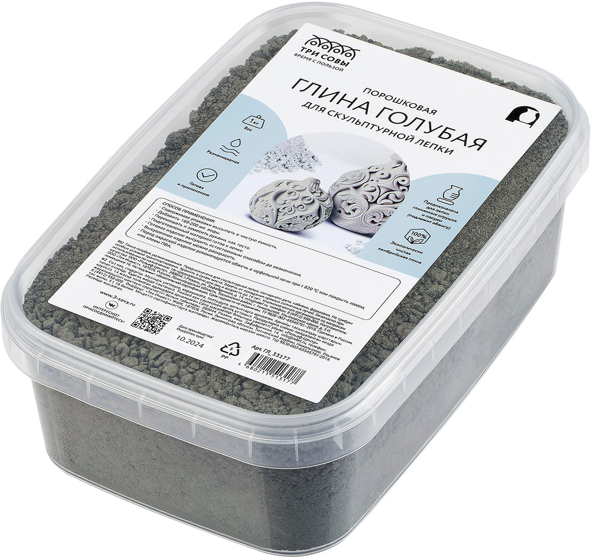 Экологически чистая кембрийская порошковая глина Чкаловского месторождения Ленинградской области при смешивании с водой образует пластичную массу, что позволяет использовать её для скульптурной и художественной лепки. Не содержит химических добавок, не вызывает аллергической реакции. Глина затвердевает на воздухе, но готовое изделие рекомендуется обжечь в муфельной печи для придания большей прочности. Готовый элемент можно раскрасить.