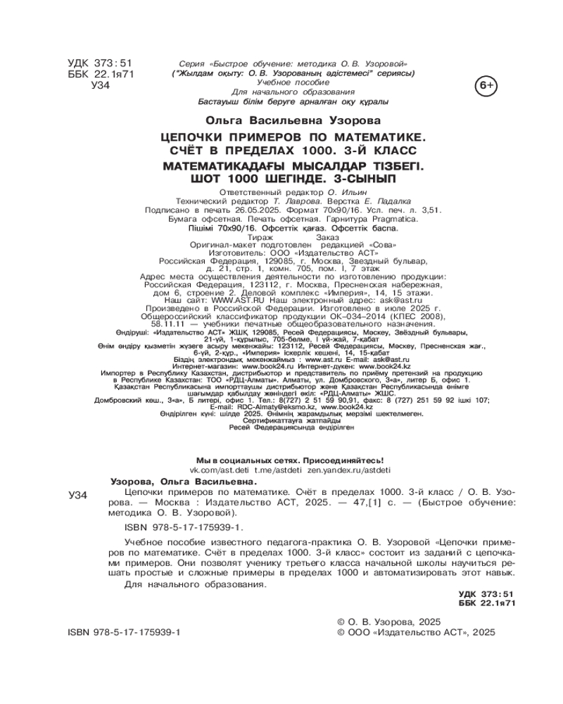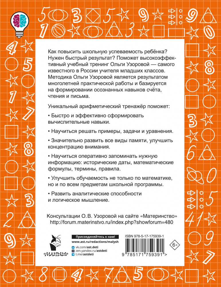 💳 Оплатить за товар можно при получении 🇰🇿 Есть бесплатная доставка по Казахстану от 1 дня 🎁 Копите бонусы с каждой покупки Серия: Быстрое обучение: методика О.В. Узоровой Учебное пособие известного педагога-практика О. В. Узоровой «Цепочки примеров по математике. Счёт в пределах 1000. 3-й класс» состоит из заданий с цепочками примеров. Они позволят ученику третьего класса начальной школы научиться решать простые и сложные примеры и автоматизировать этот навык. Благодаря критериям оценки под каждым заданием ребёнок получит мотивацию научиться быстро применять вычислительные навыки. Пособие можно использовать для работы в классе и дома по всем федеральным программам начальной школы. Для начального образования. |