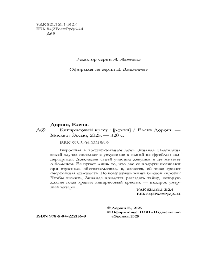 💳 Оплатить за товар можно при получении 🇰🇿 Есть бесплатная доставка по Казахстану от 1 дня 🎁 Копите бонусы с каждой покупки Серия: Вечерний детектив Елены Дорош (новое оформление) Выросшая в воспитательном доме Зинаида Надеждина волей случая попадает в услужение к одной из фрейлин императрицы. Довольная своей участью девушка и не мечтает о большем. Ее пугает лишь то, что две ее подруги погибают при странных обстоятельствах, и, кажется, ей тоже грозит смертельная опасность. Но кому нужна жизнь бедной сироты? Чтобы выжить, Зинаиде придется разгадать тайну, которую долгие годы хранил кипарисовый крестик — подарок умершей матери... |