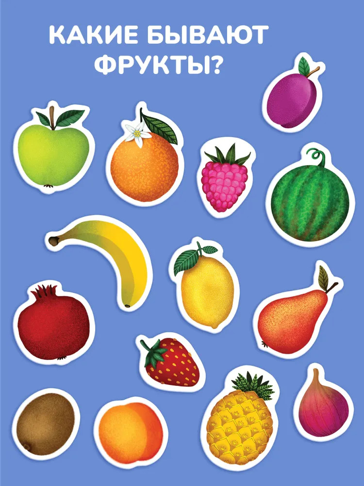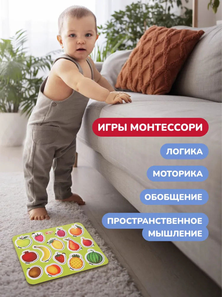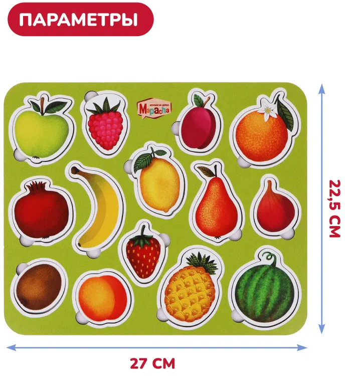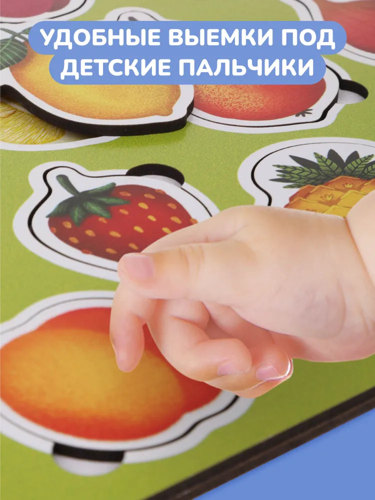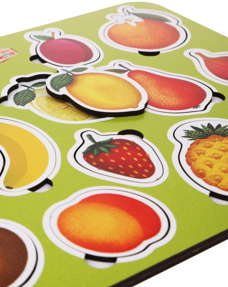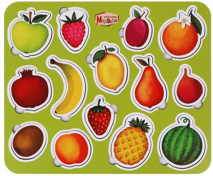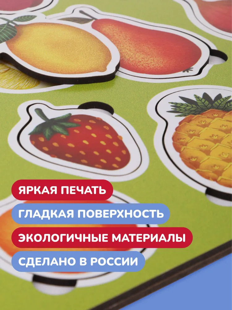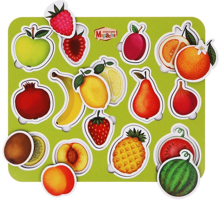 Вкладыши для малышей «Фрукты» способствует развитию воображения, памяти и логики. В комплекте — игровая основа с фигурными углублениями и 14 деталей-вкладышей в виде фруктов. На доске с вкладышами есть удобные отверстия для пальчиков, адаптированные по размеру специально для ребенка. Благодаря ним вкладыши удобно вынимать. Вкладыши тщательно отшлифованы — они гладкие и тактильно приятные. На нижней части доски изображены фрукты в разрезе для развития представлений ребенка о том, как фрукты выглядят не только внутри, но и снаружи. |
