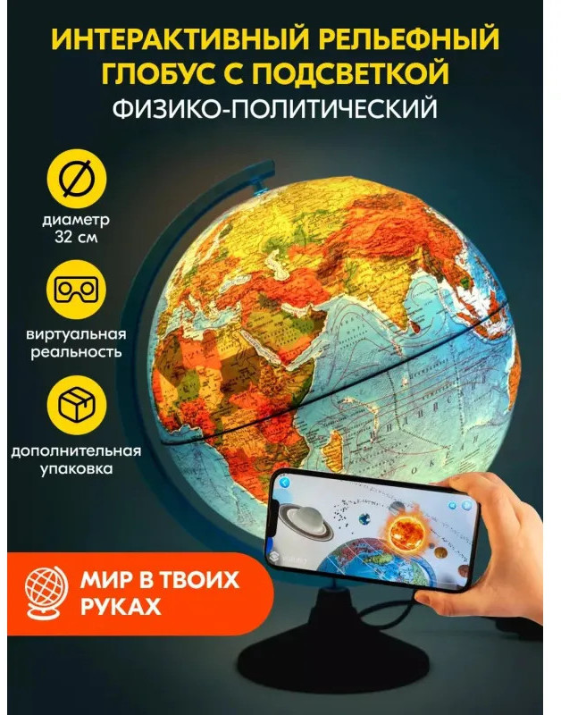 Globen Глобус интерактивный физико-политический с подсветкой рельефныйВ данный момент этот товар отсутствует в продаже. Возможно, у нас найдется аналогичный или похожий товар здесь. Глобус Globen физико-политический 32 см интерактивный рельефный с подсветкой Глобус - идеальное учебное пособие для изучения географии в школе и дома. Глобус интерактивный, поддерживает дополненную реальность с помощью специального мобильного приложения. На карту глобуса нанесены страны мира, названия городов и другая полезная информация, а также детальный рельеф ландшафта. Рельефная поверхность отражена с помощью выпуклостей на поверхности глобуса. При включении подсветки глобус превращается в наглядную политическую карту: чётко выделяются границы стран, каждая из которых окрашена в свой цвет. В вечернее и ночное время глобус можно использовать как ночник. Подставка глобуса выполнена из высококачественного пластика чёрного цвета. Размер глобуса: 44x35 см. Питание от сети, в комплекте поставляется шнур с выключателем. Изображения товаров на сайте не могут гарантировать точную цветопередачу. Законодательные и технические документы |